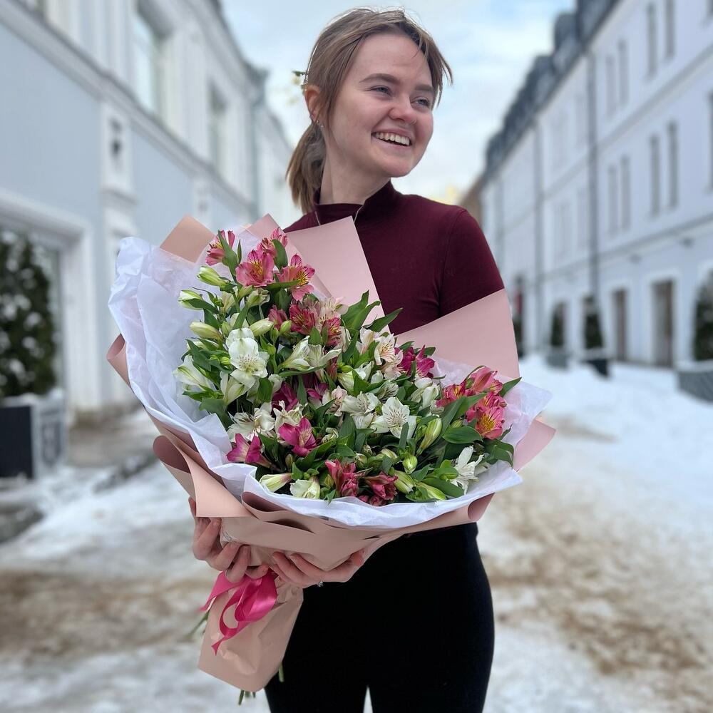 Альстромерия – 25 шт.Лента атласная – 1 шт.Тишью – 3 шт.Пленка матовая – 1 шт.