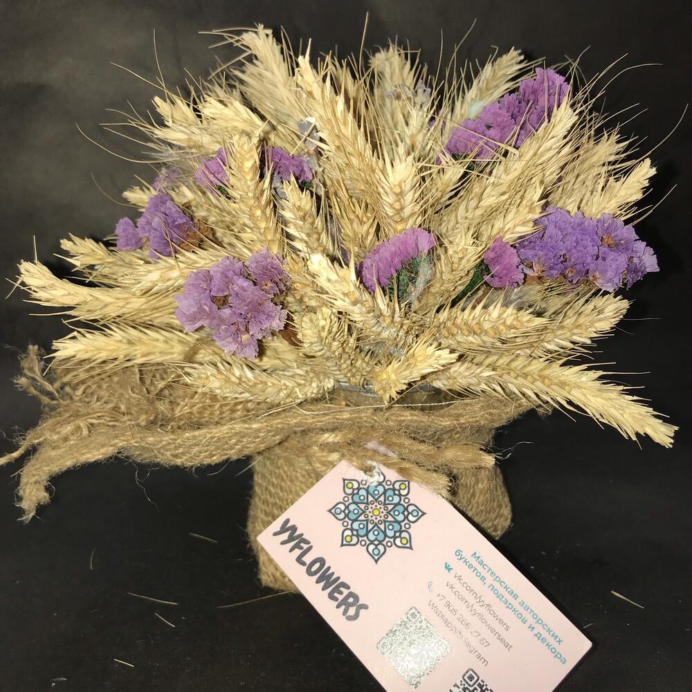 «Лавандовое созвездие» Букет из розы, гвоздики, статица и хлопка
