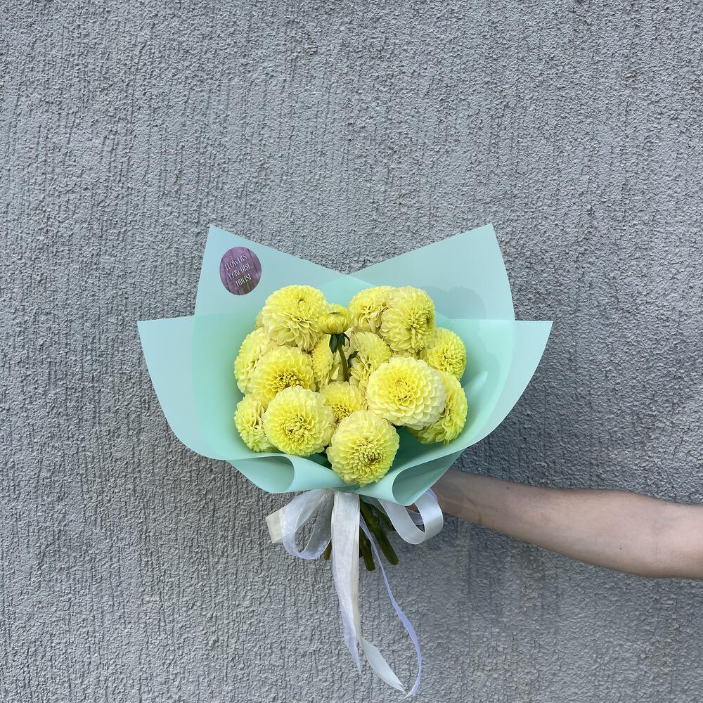 георгины – 17 шт. Упаковка – 1 шт. Атласная лента – 1 шт.