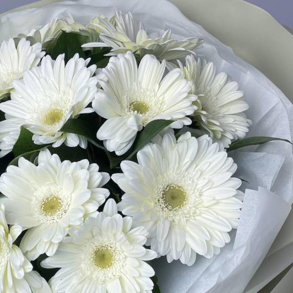 Гербера белая – 17 шт.Салал пучок – 1 шт.Пленка матовая – 8 шт.Тишью белое – 2 шт.