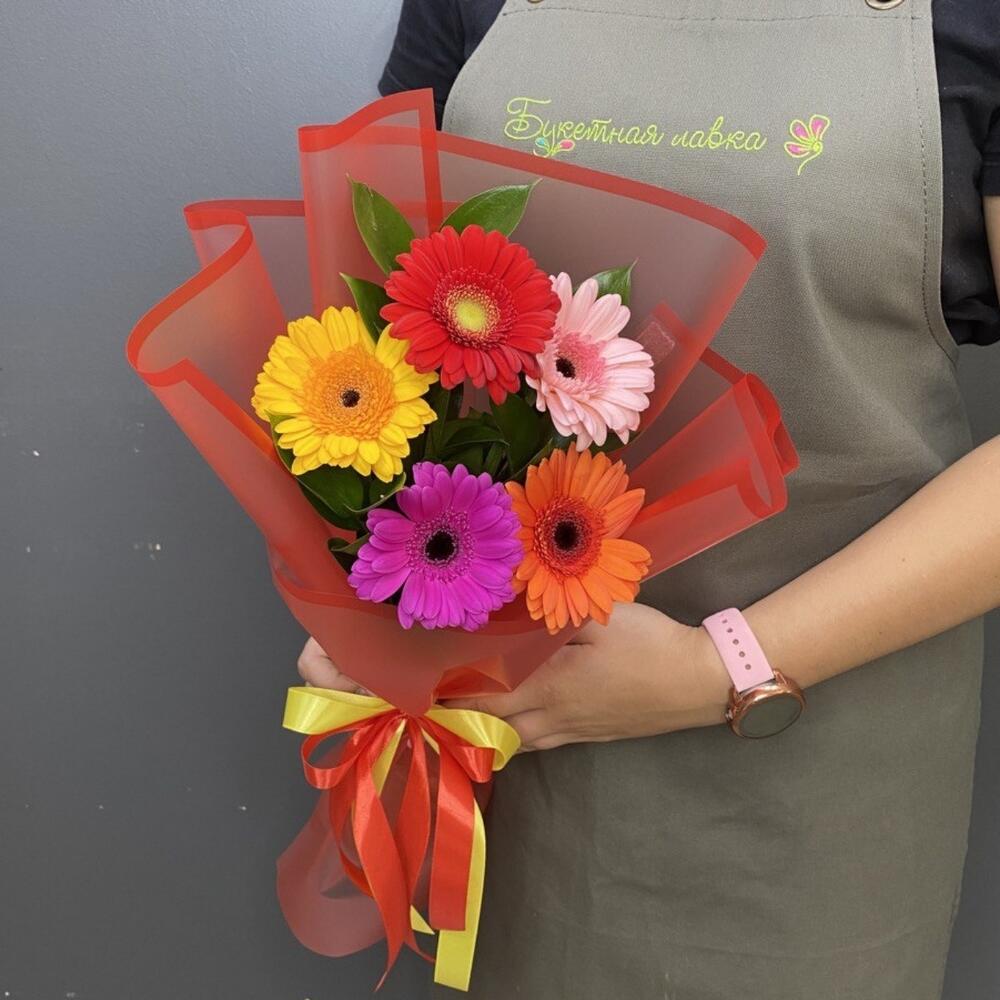 Рускус – 6 шт.Лента атласная – 1 шт.Гербера мини – 5 шт.Упаковка дизайнерская – 1 шт.