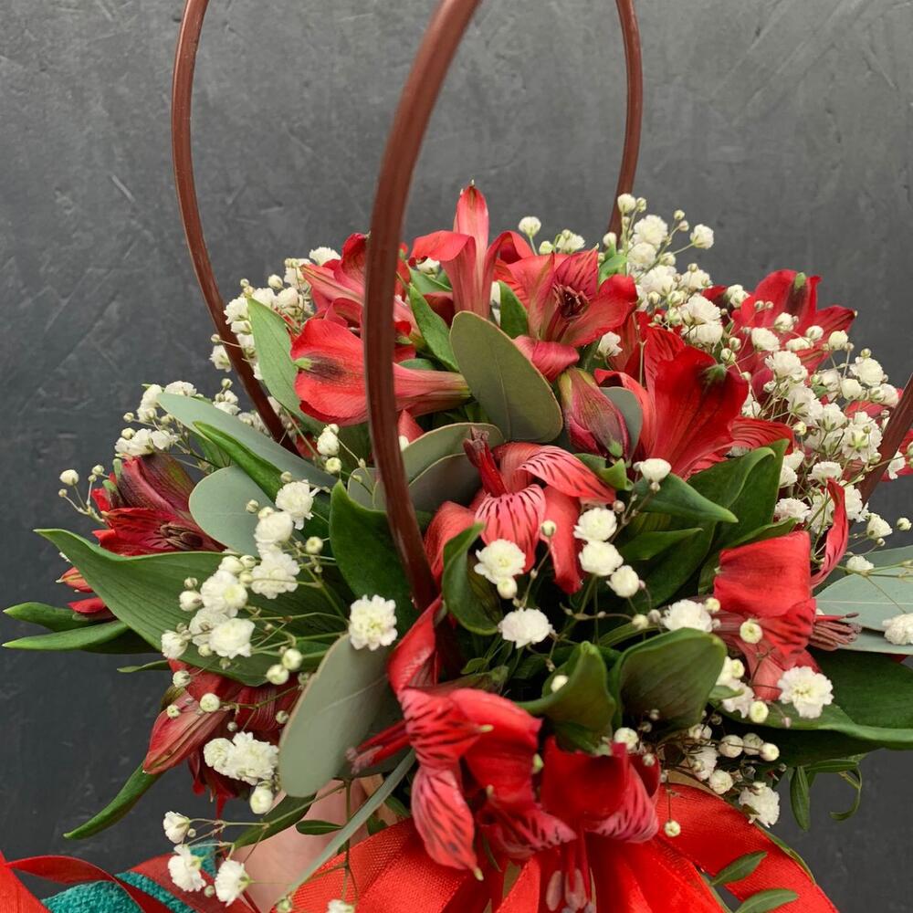 Альстромерия – 5 шт.Гипсофила – 2 шт.Фисташка – 5 шт.Эвкалипт – 5 шт.Сумочка картонная – 1 шт.Оазис флористический – 1 шт.Лента атласная – 3 шт.