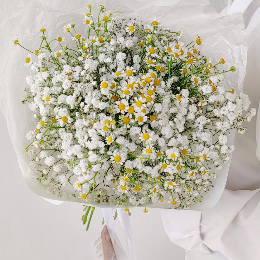 Букет из гипсофилы и ромашек