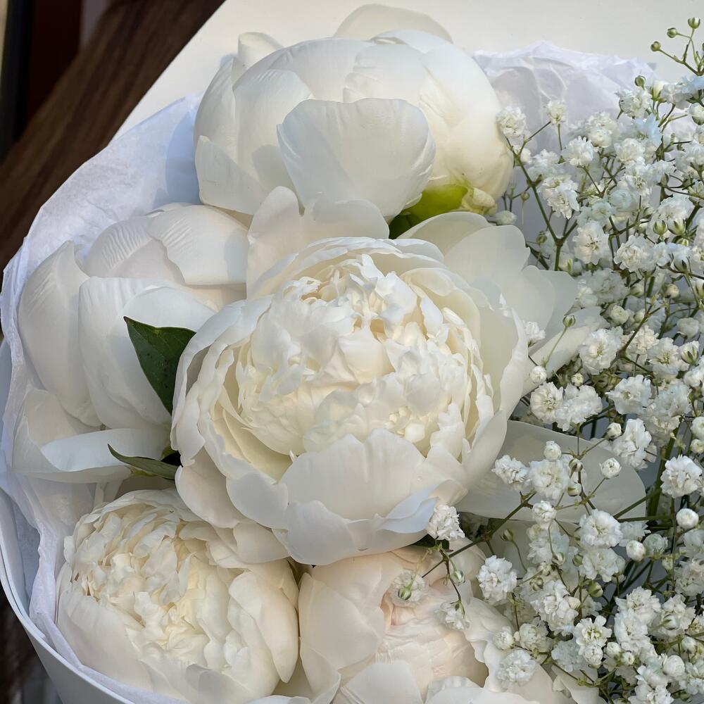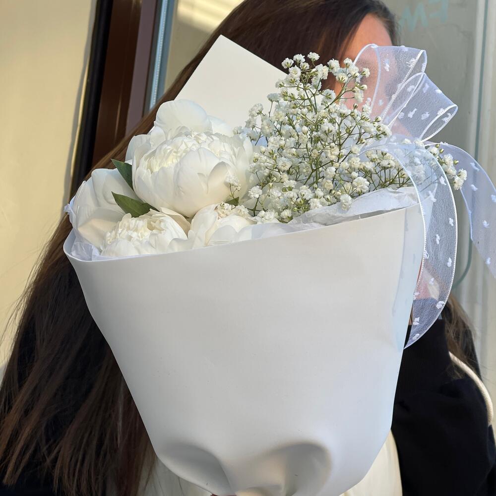Гипсофила – 2 шт.Лента – 1 шт.Пион – 5 шт.Упаковка – 1 шт.