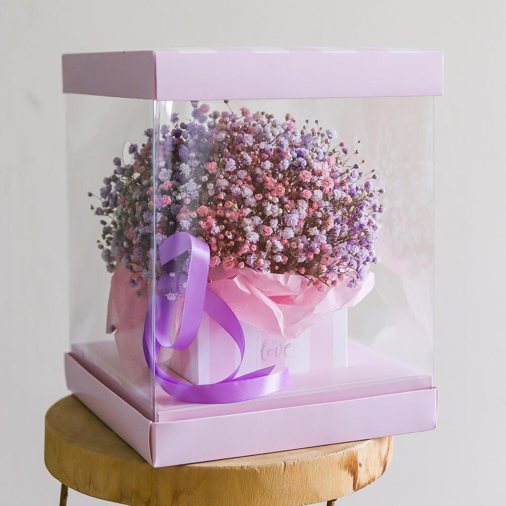 Гипсофила – 5 шт.Оазис флористический – 1 шт.Лента атласная – 2 шт.транспортировочная упаковка – 1 шт.инструкция по уходу за цветами – 1 шт.