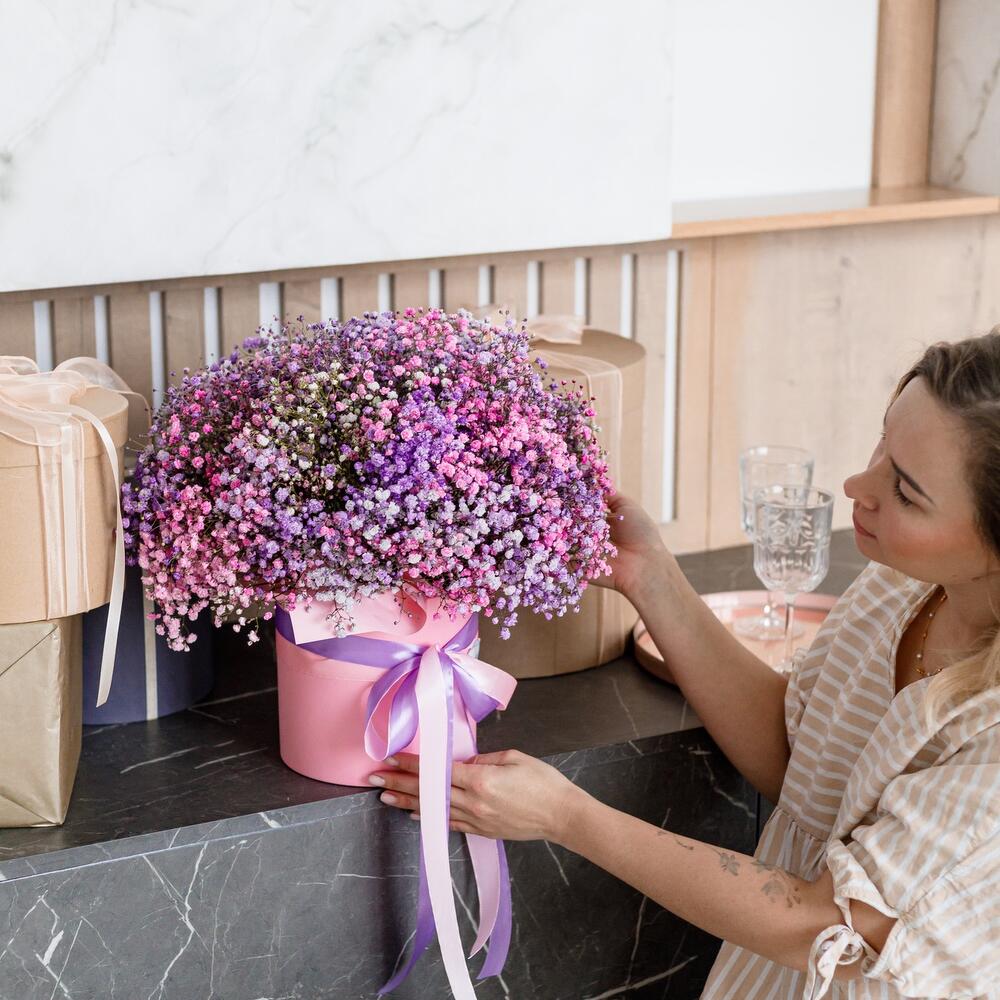 “Сиреневый туман” – композиция из гипсофилы в шляпной коробке