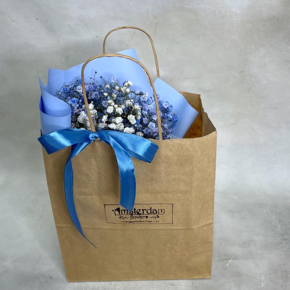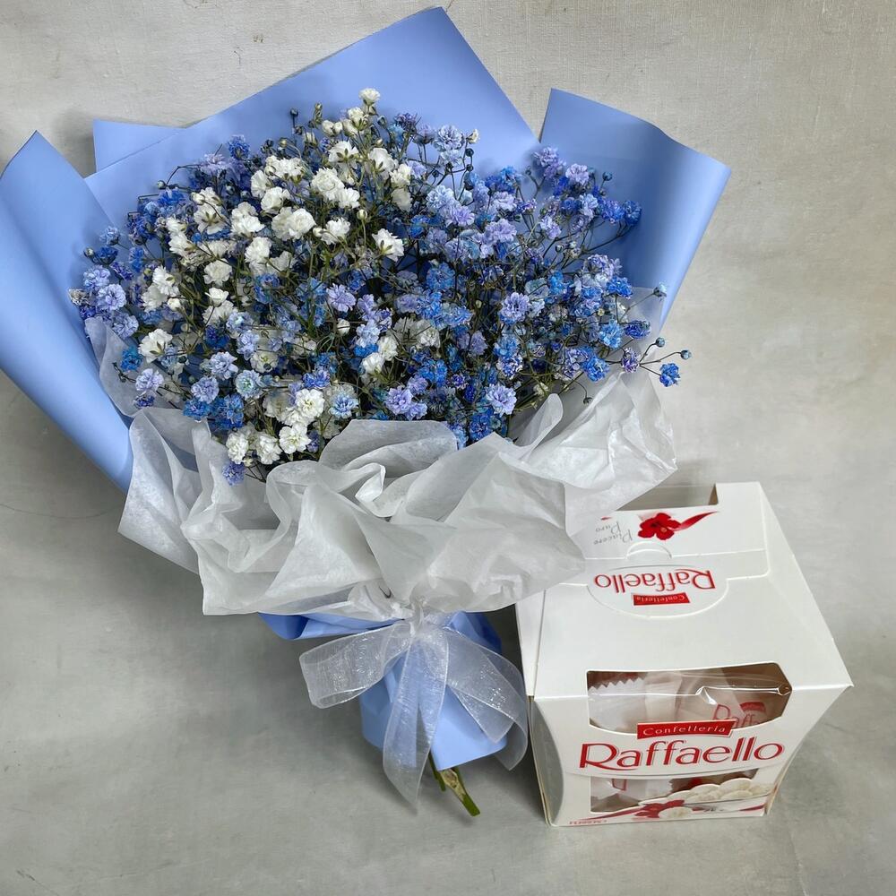 Подарочный набор – Букетик синей гипсофилы (размеры: 25 см высота, 20 см ширина) с коробкой конфет Raffaello. Доставляется в крафтовом пакете (высота 25 см, ширина 22 см, глубина 12 см).
