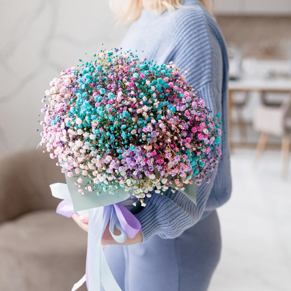 Очаровательная, воздушная композиция из гипсофилы, в шляпной коробке.Цветы стоят в специальной флористической губке,что позволяет им больше оставаться свежими и радовать получателя. Так же композиция в коробке это очень удобно и эффектно, так как не надо ставить букет в вазу и менять воду. Необходимо лишь подливать в губку воду.Инструкция по уходу за цветами прикреплена к каждому заказу.Цветы гипсофилы отличаются стойкостью и даже при высыхании не теряют, декоративности и цвета. Что позволяет, долгое время украшать интерьер в качестве сухоцветов.Подпишем открытку с вашими пожеланиями бесплатно