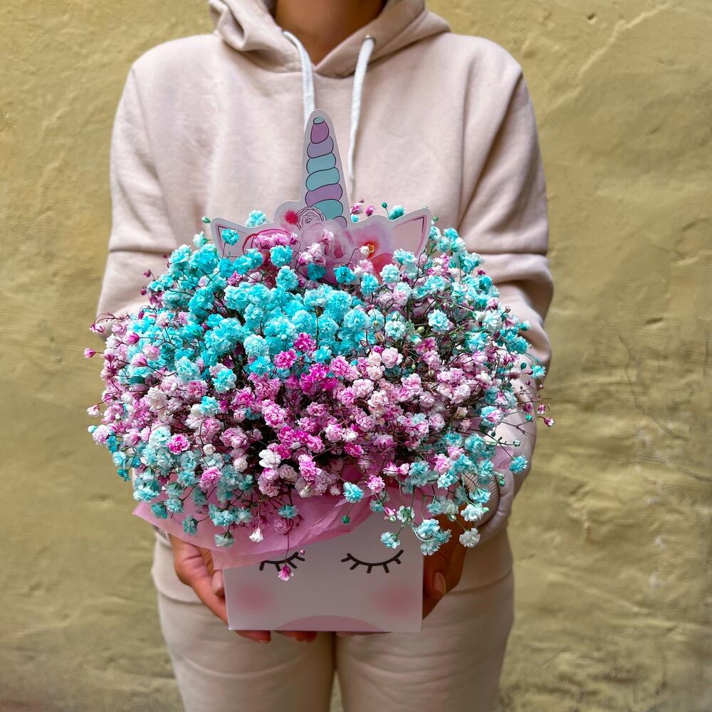 Гипсофила – 5 шт.коробка единорог – 1 шт.Оазис флористический – 1 шт.Тишью – 4 шт.