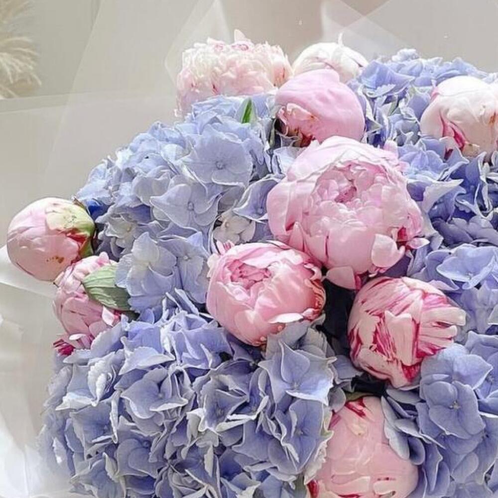 гортензии голубые – 4 шт.Пион розовый – 15 шт.Упаковка дизайнерская – 1 шт.Лента атласная – 2 шт.Открыточка с вашими пожеланиями – 1 шт.хорошее настроение – 100 шт.инструкция по уходу за цветами – 1 шт.коробка переноска – 1 шт.Кризал – 1 шт.