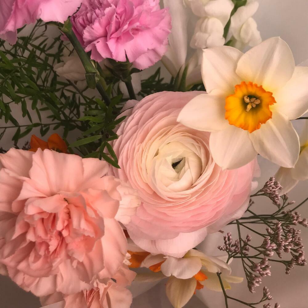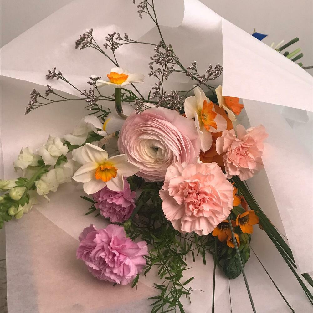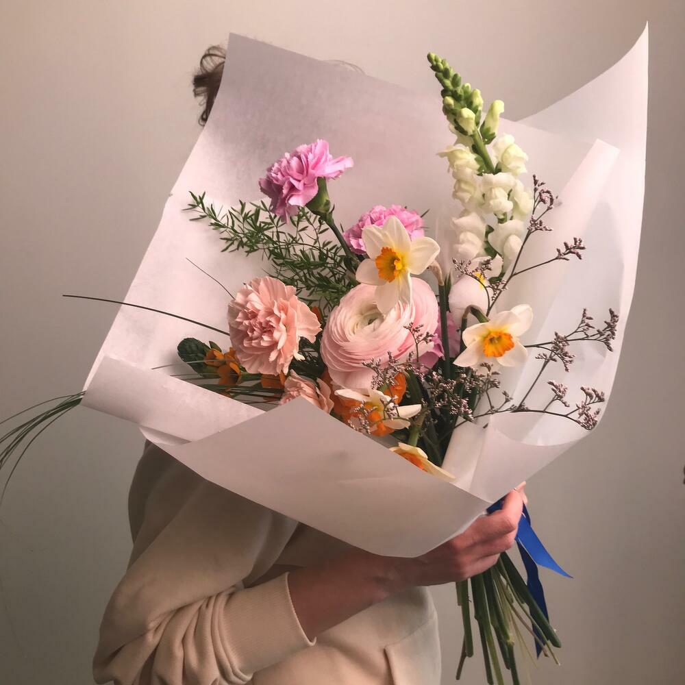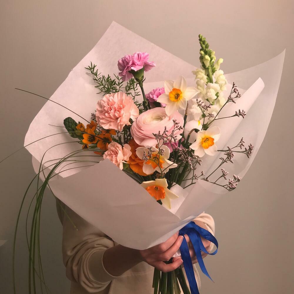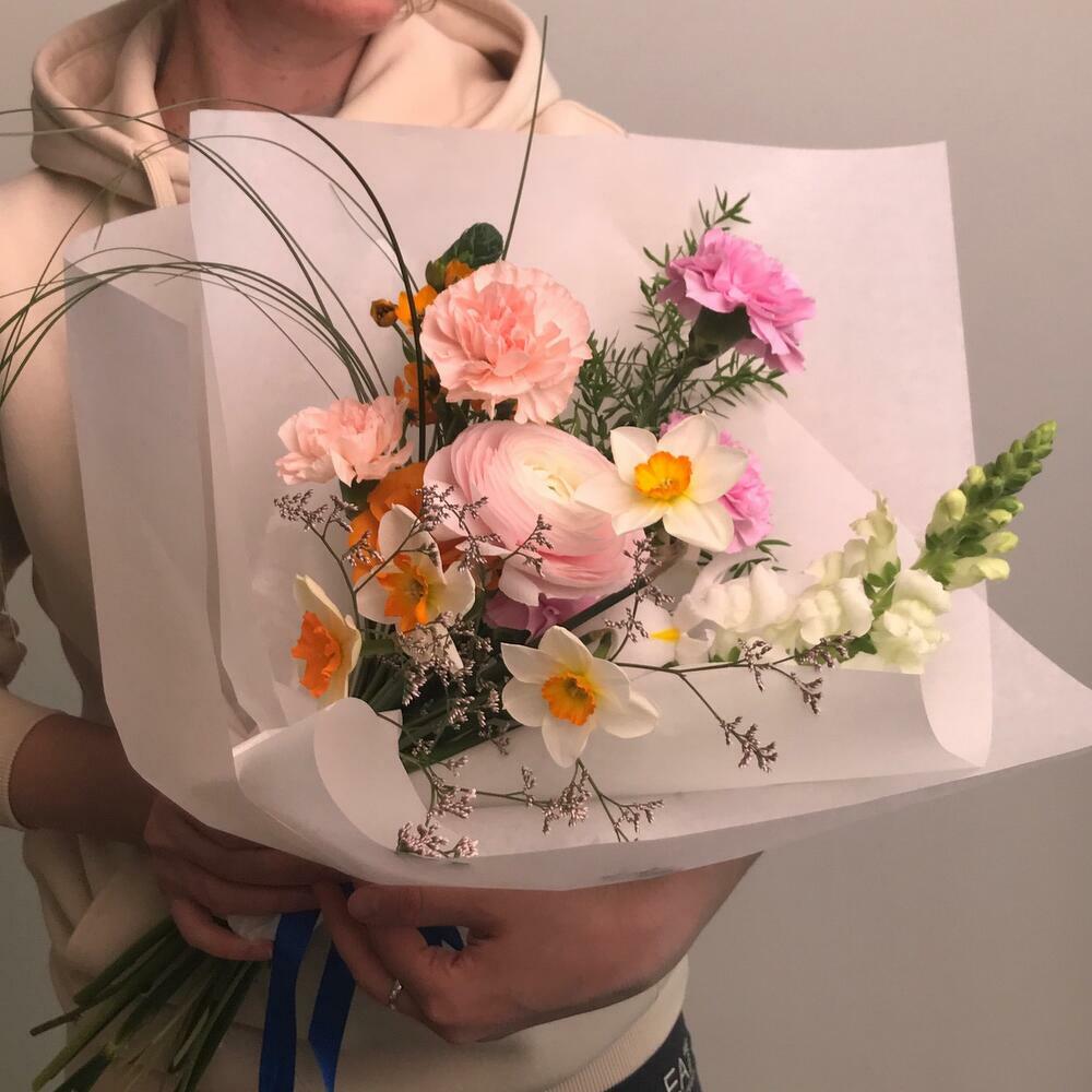Ранункулюс – 1 шт.Ирис – 1 шт.Нарцисс – 4 шт.Гвоздика – 5 шт.Орнитогалум – 1 шт.антиринум – 1 шт.аспарангус – 1 шт.