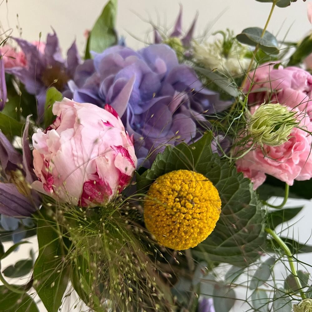 Гортензия – 1 шт.Дельфиниум – 3 шт.Гвоздика кустовая – 5 шт.Пион Сара Бернар – 3 шт.Клематис лиловый – 5 шт.зелень декоративная – 5 шт.