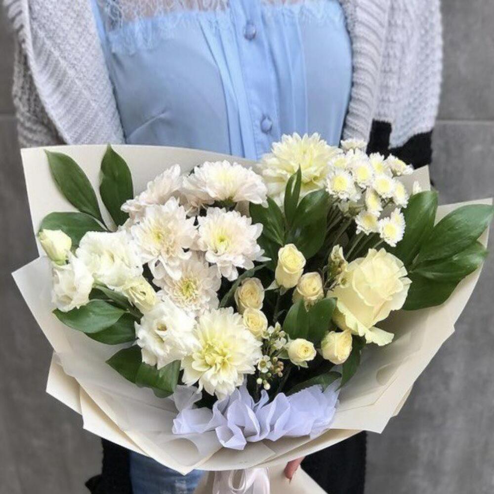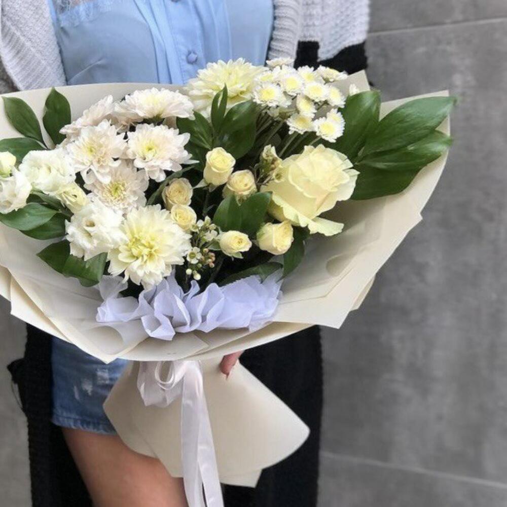 Альстромерии, Гвоздики, Кустовые розы, Лизиантусы, Розы, Хризантемы