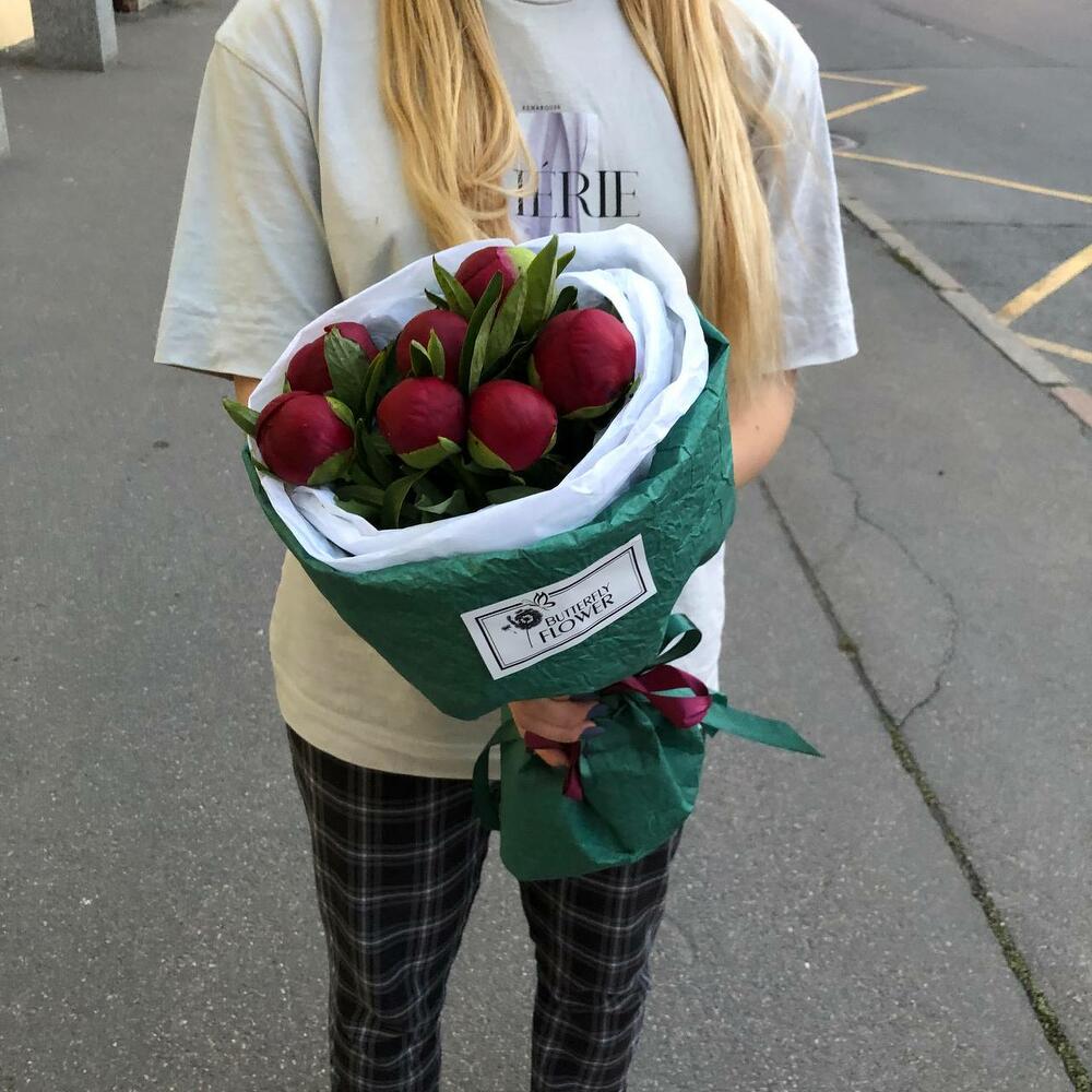 Букет из 7 бордовых пионов в дизайнерской упаковке "Лючия Грация"