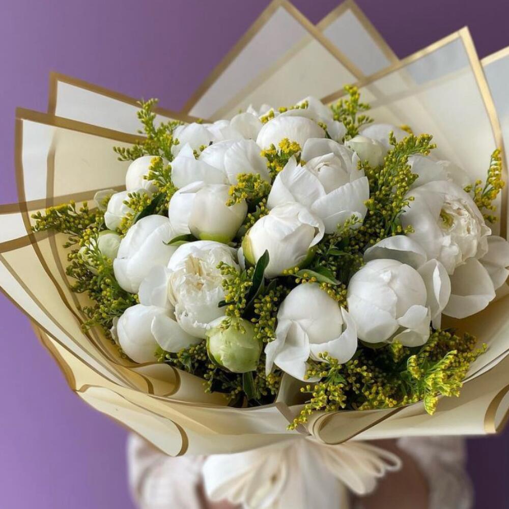 Пион белый – 21 шт.Мимоза – 16 шт.Упаковка дизайнерская – 2 шт.Лента атласная – 2 шт.Открыточка с вашими пожеланиями – 1 шт.хорошее настроение – 100 шт.инструкция по уходу за цветами – 1 шт.коробка переноска – 1 шт.Кризал – 1 шт.