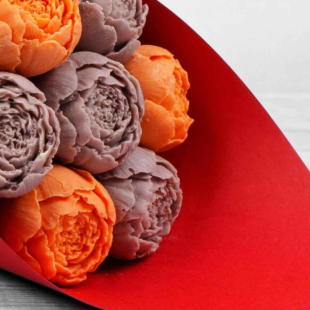 Букет из шоколадных пионов оранжево-сиреневый в дизайнерском картоне