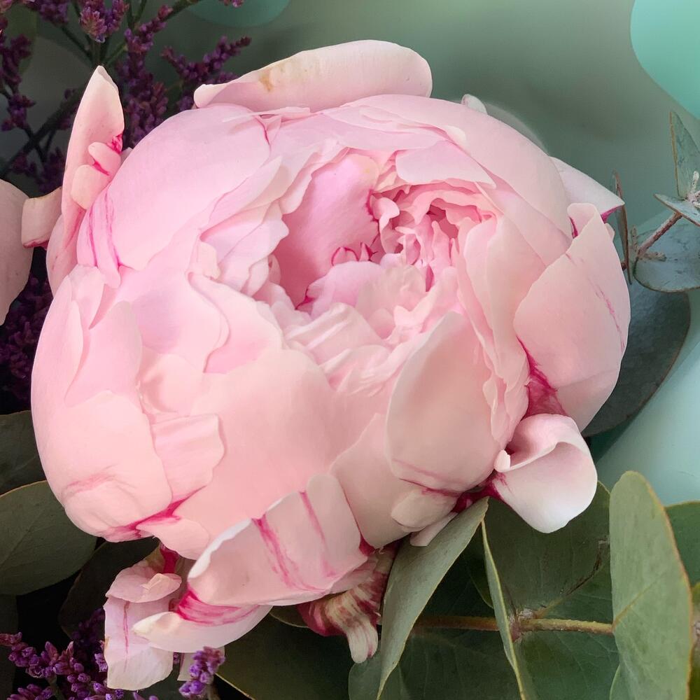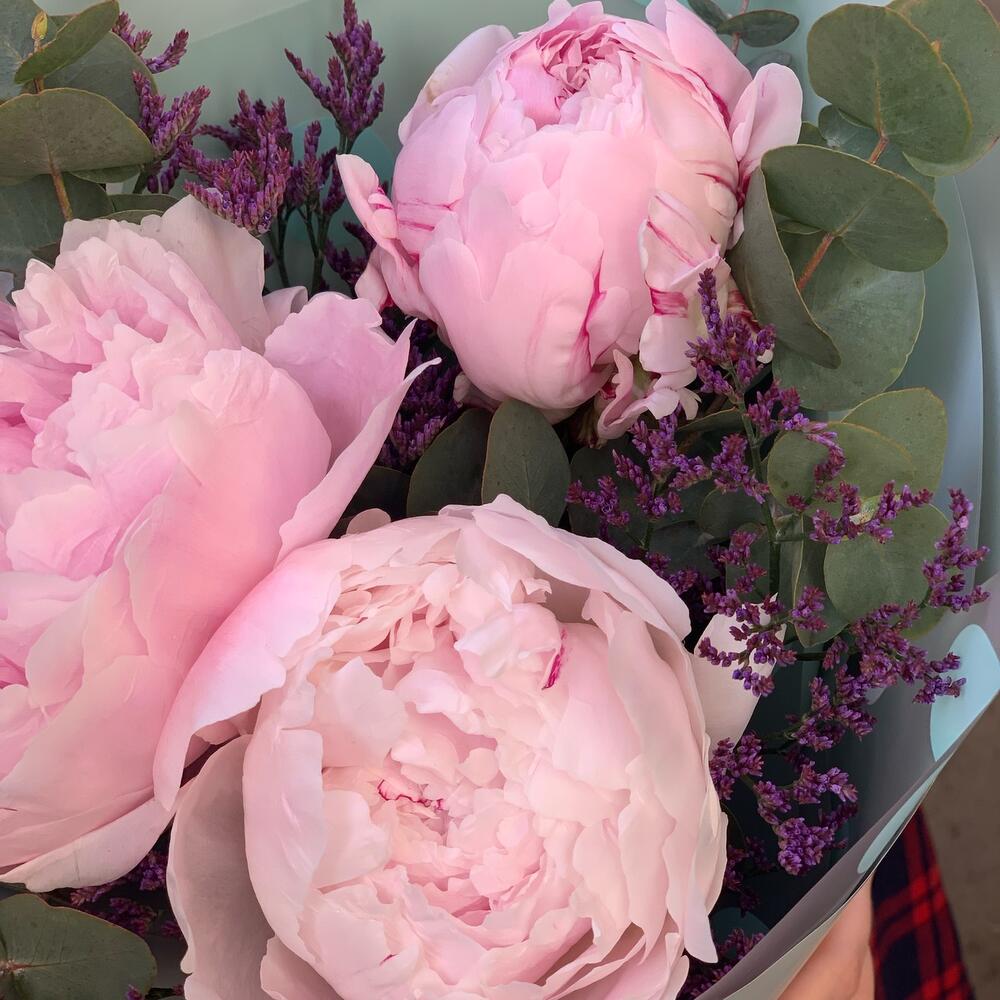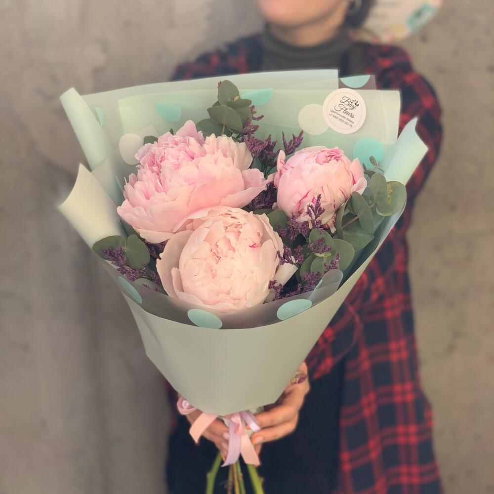 Пион Сара Бернар – 3 шт.зелень декоративная – 3 шт.Лимониум – 2 шт.Упаковка дизайнерская – 1 шт.