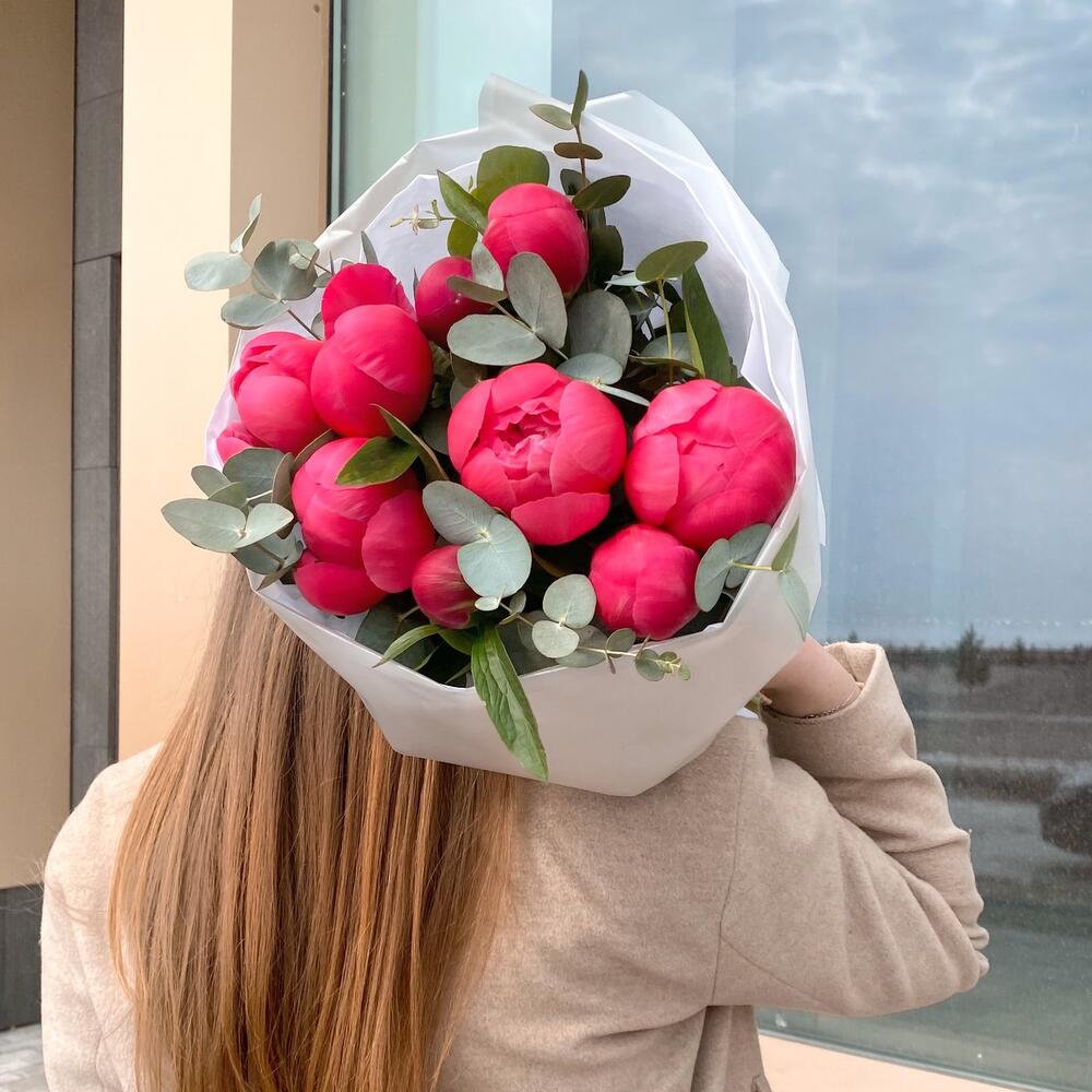 Монобукет из пионов корал шарм с эвкалиптом / 1370 id