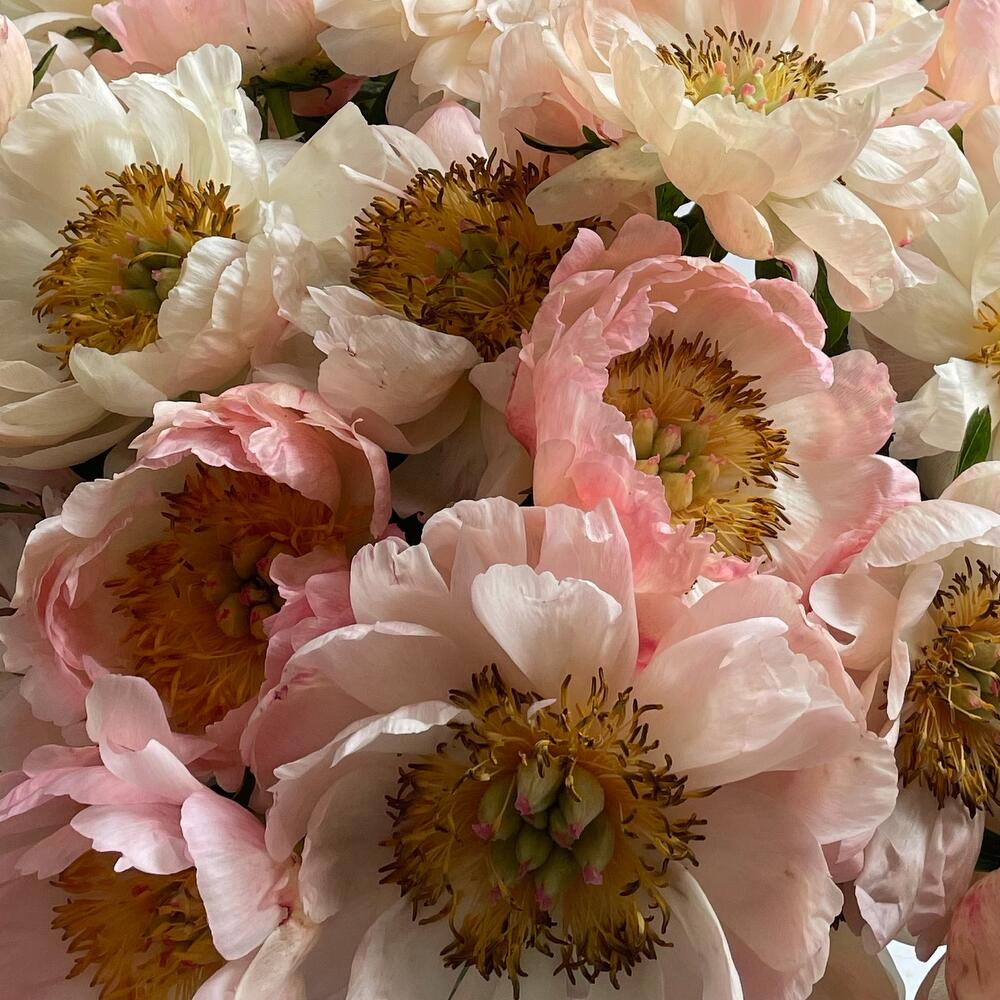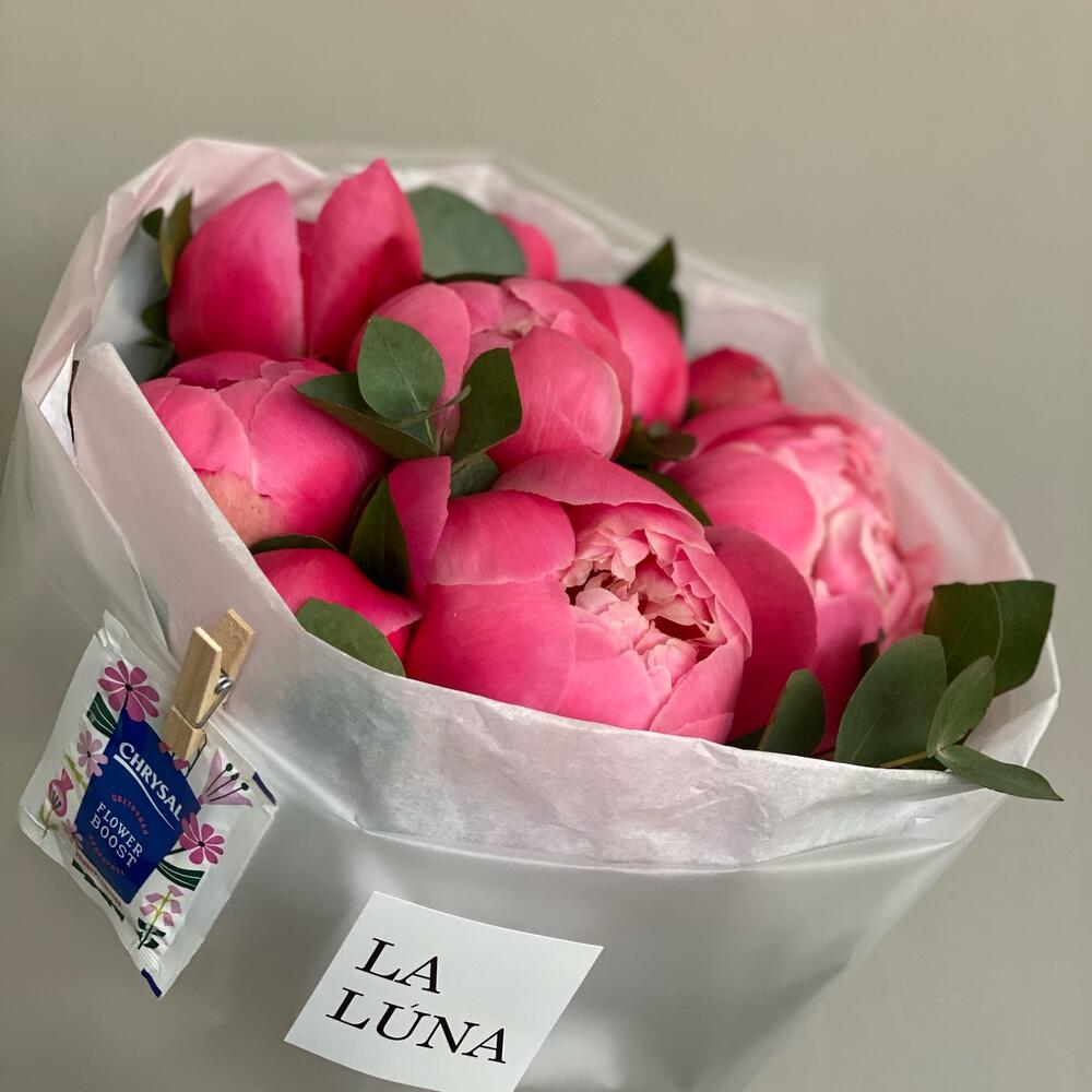 Пион Коралл Шарм (Coral Charm) – 9 шт.Упаковка – 1 шт.Лента атласная – 1 шт.Кризал (подкормка) – 1 шт.инструкция по уходу за цветами – 1 шт.эвкалипт cineria – 1 шт.