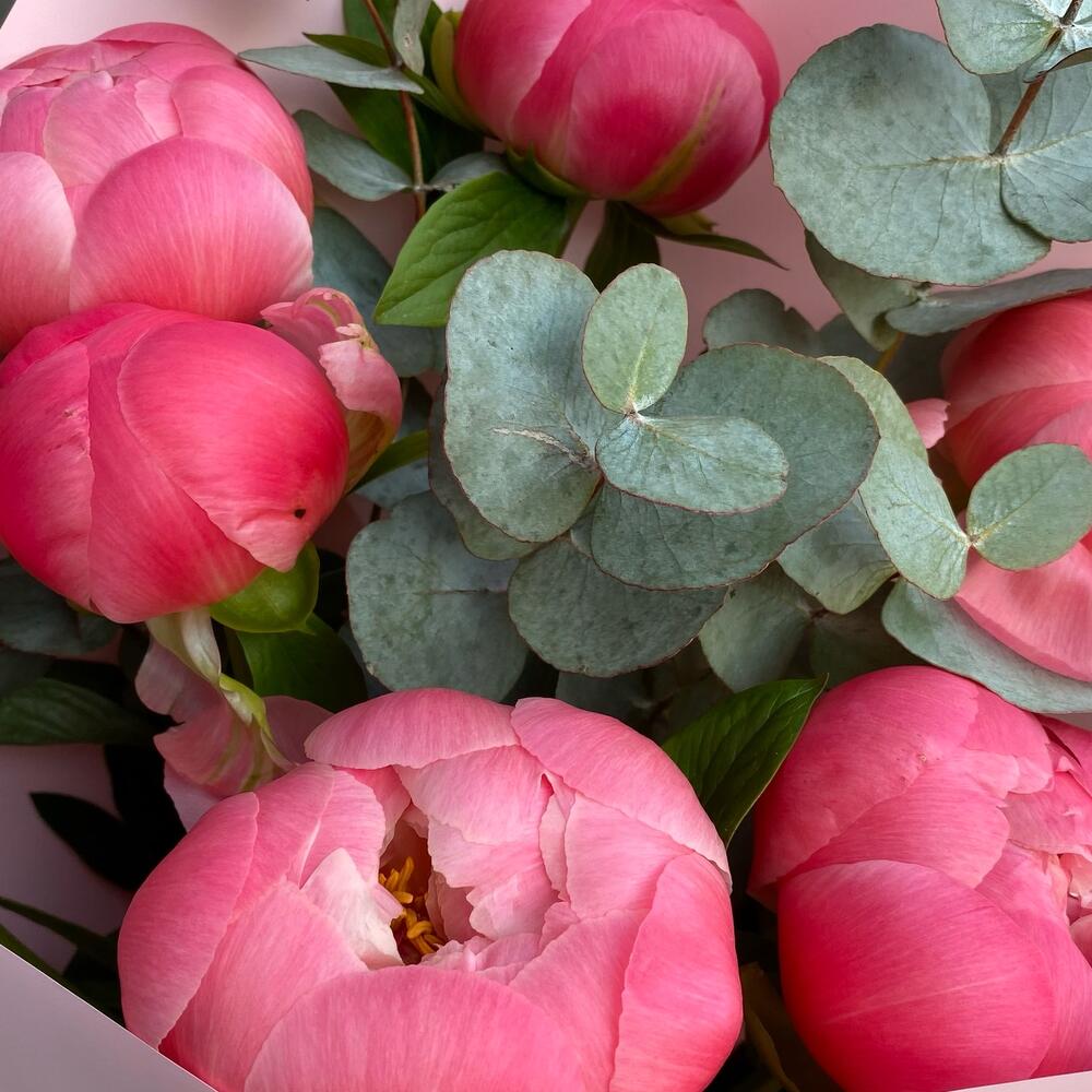 Пион Коралл Шарм (Coral Charm) – 7 шт.Лента атласная – 1 шт.Эвкалипт Синерия – 1 шт.Дизайнерская упаковка – 1 шт.