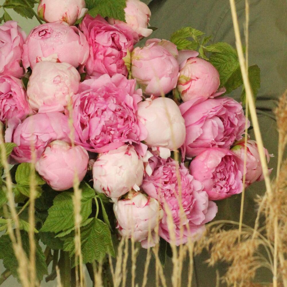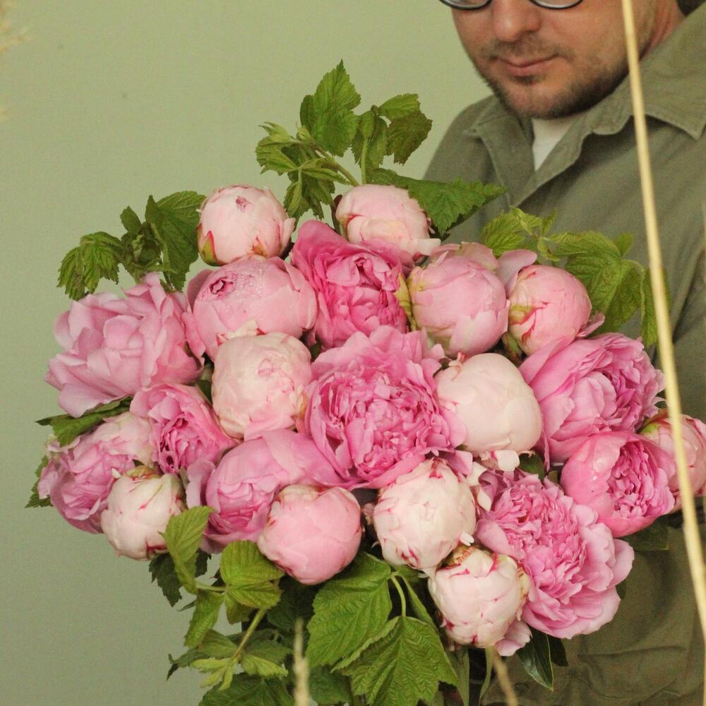 Охапка нежных пионов с веточками малины.
