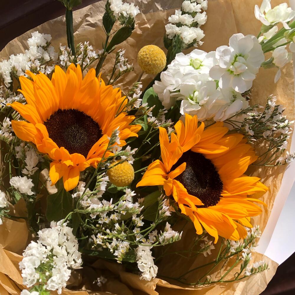 Краспедия – 2 шт.Лента – 1 шт.Лимониум – 1 шт.Статица – 2 шт.Тишью – 2 шт.Пленка матовая – 3 шт.маттиола белая ароматная – 1 шт.подсолнух гелиантус – 2 шт.