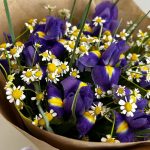 Букет из нежной ромашки и ярких фиолетовых ирисов