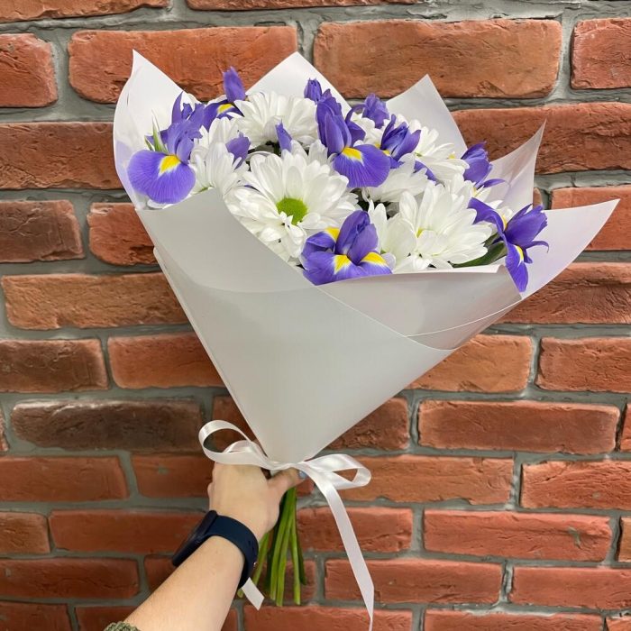 Ирис Blue Magic – 9 шт.Бакарди ромашка – 4 шт.Упаковка белая – 1 шт.Лента атласная – 1 шт.