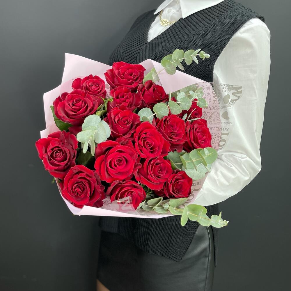 Роза – 17 шт.Эвкалипт – 5 шт.Упаковка дизайнерская – 5 шт.