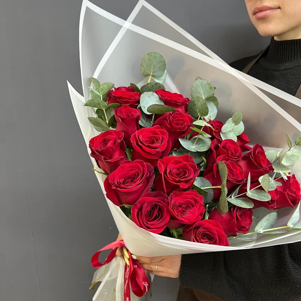 21 красная роза с эвкалиптом