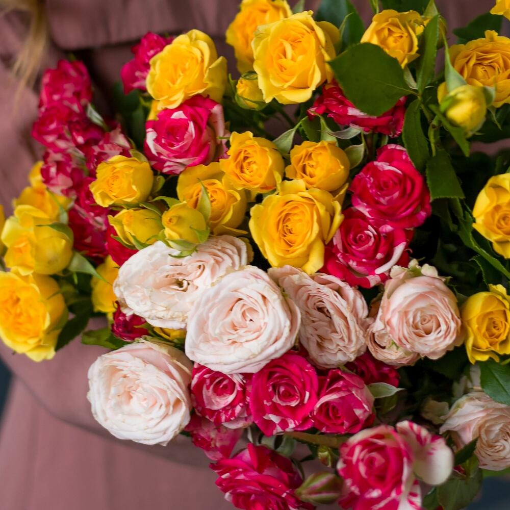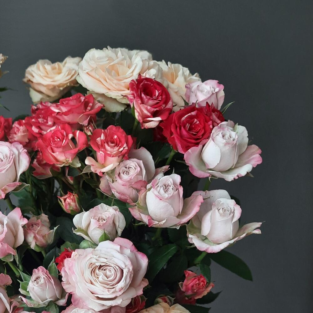 кустовая роза микс – 9 шт.Лента атласная – 1 шт.