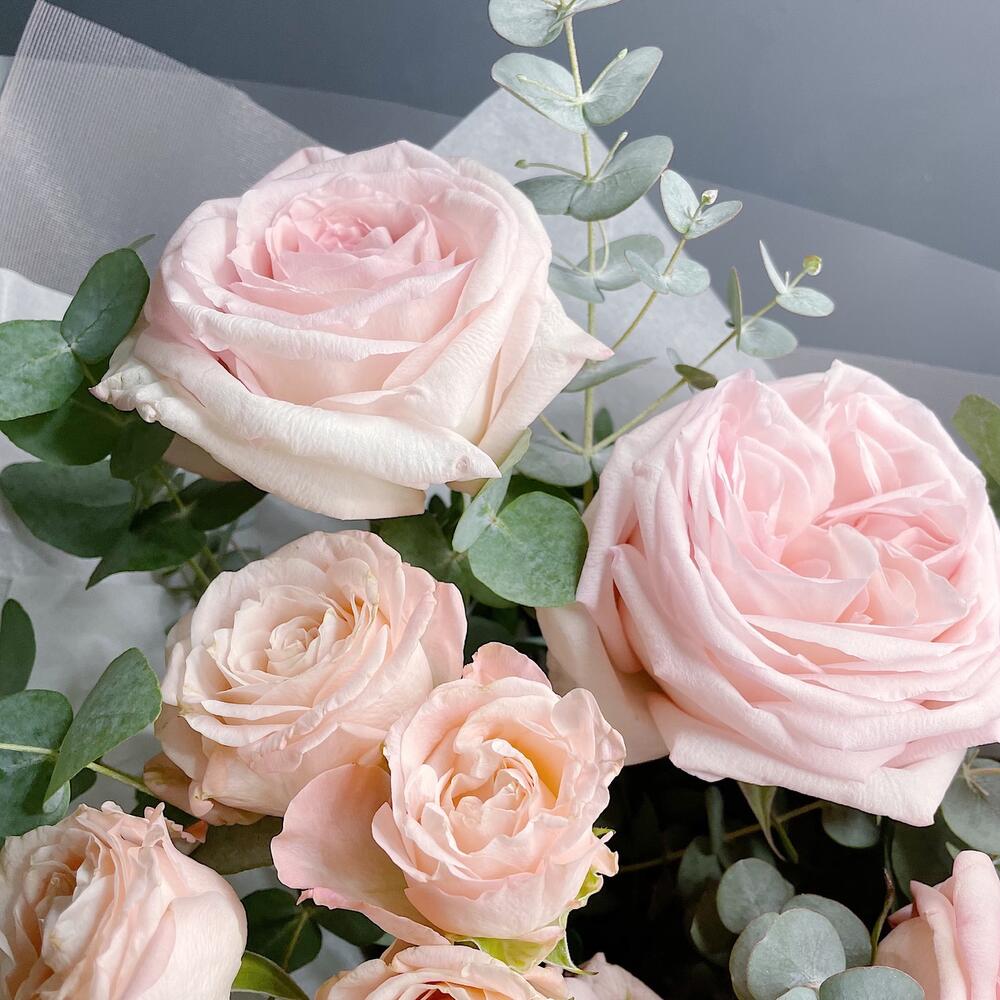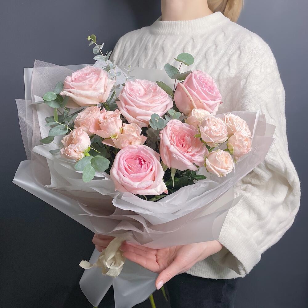 Эвкалипт – 2 шт.Упаковка дизайнерская – 1 шт.Роза пионовидная розовая – 5 шт.роза кустовая пионовидная розовая – 2 шт.