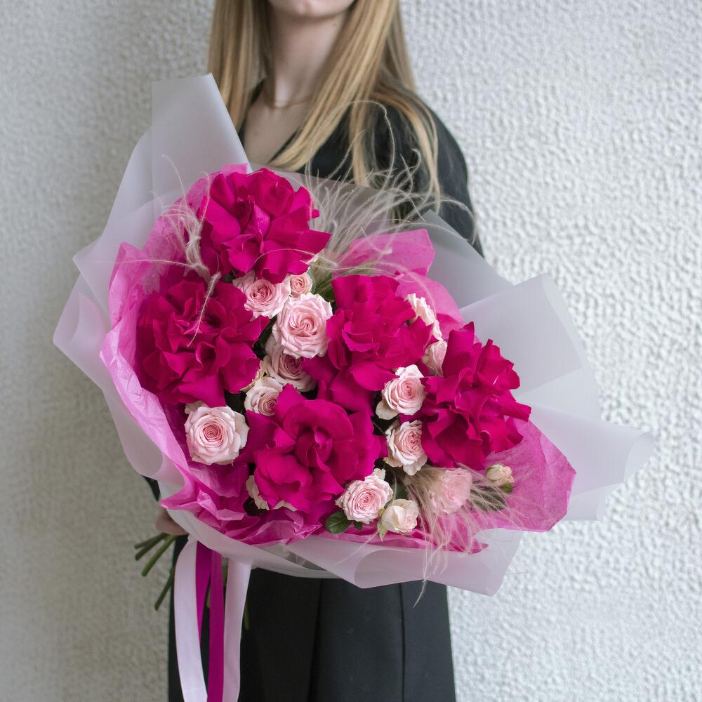 роза французская готча – 5 шт.Роза кустовая – 4 шт.пеннисетум – 2 шт.Упаковка – 1 шт.