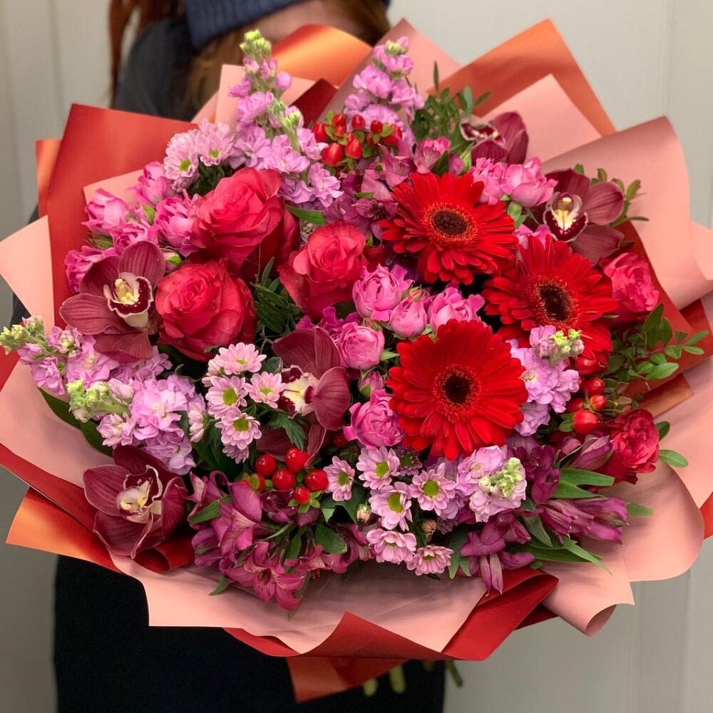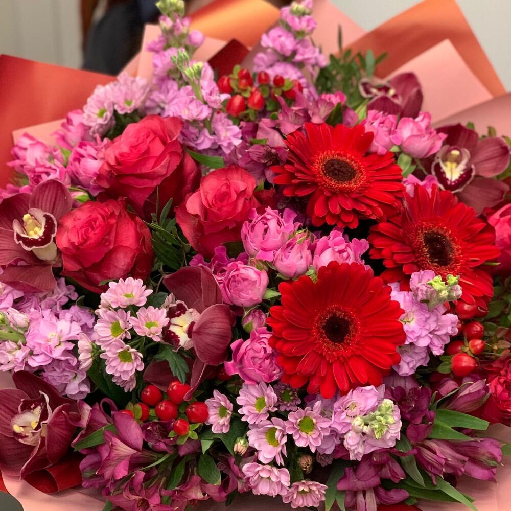Гербера – 3 шт.Сантини – 3 шт.Орхидея Цимбидиум – 5 шт.Роза – 5 шт.Альстромерия – 3 шт.Маттиола – 7 шт.Гиперикум – 3 шт.Роза кустовая – 3 шт.Зелень – 5 шт.Упаковка дизайнерская – 3 шт.