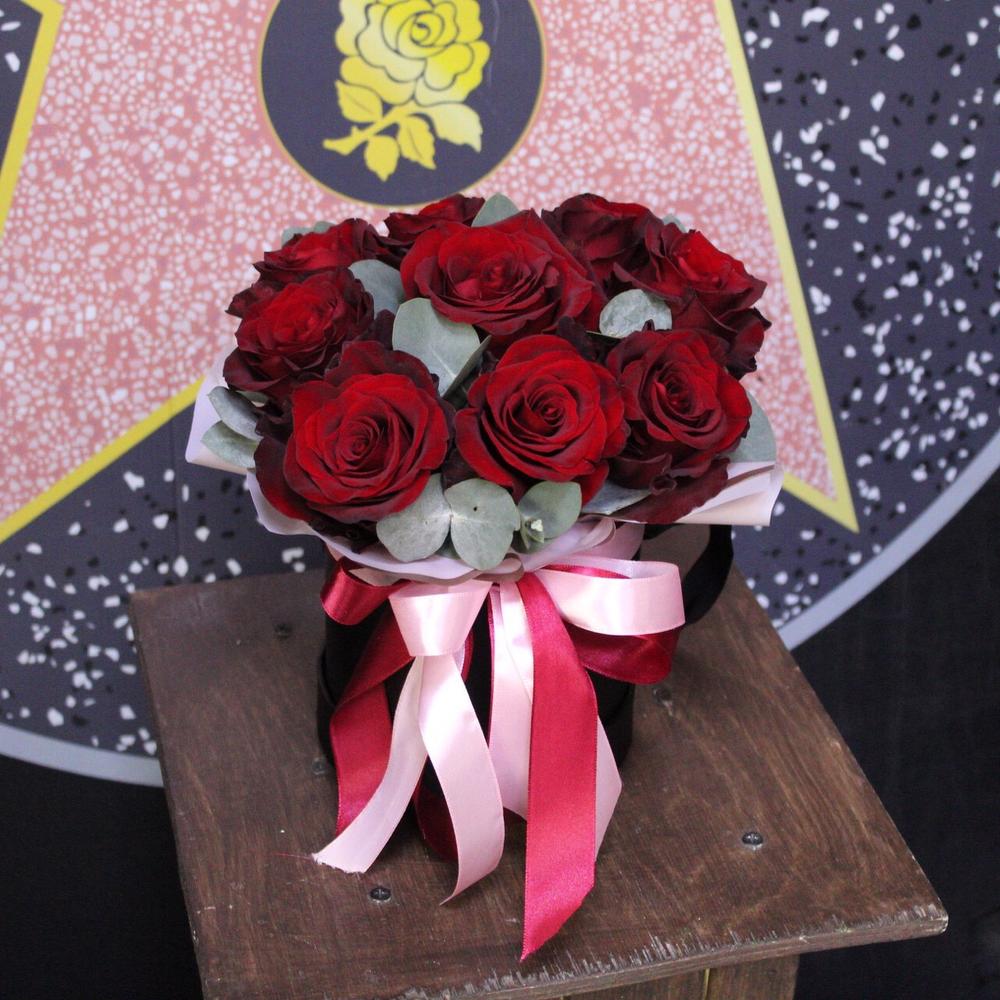 Роза Эксплорер – 9 шт.Эвкалипт – 3 шт.Пленка дизайнерская – 1 шт.Оазис флористический – 1 шт.Коробка шляпная – 1 шт.Лента атласная – 2 шт.
