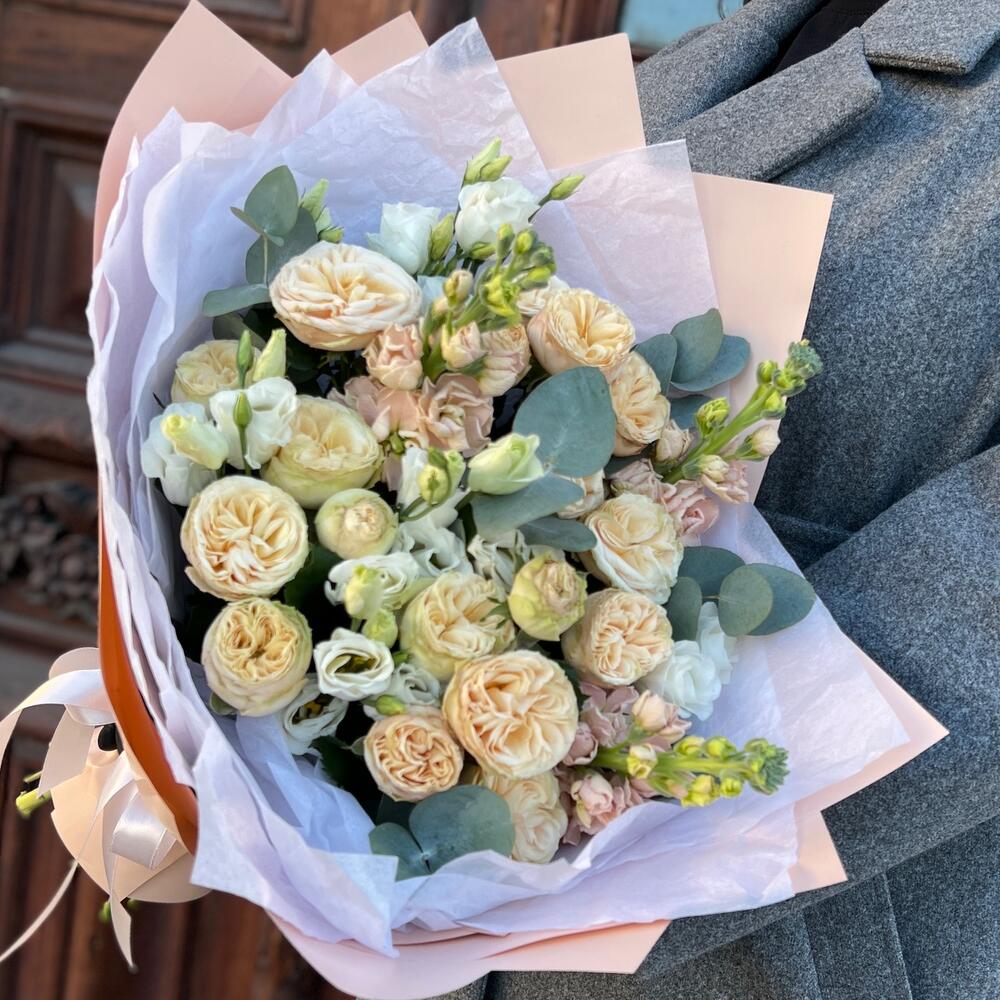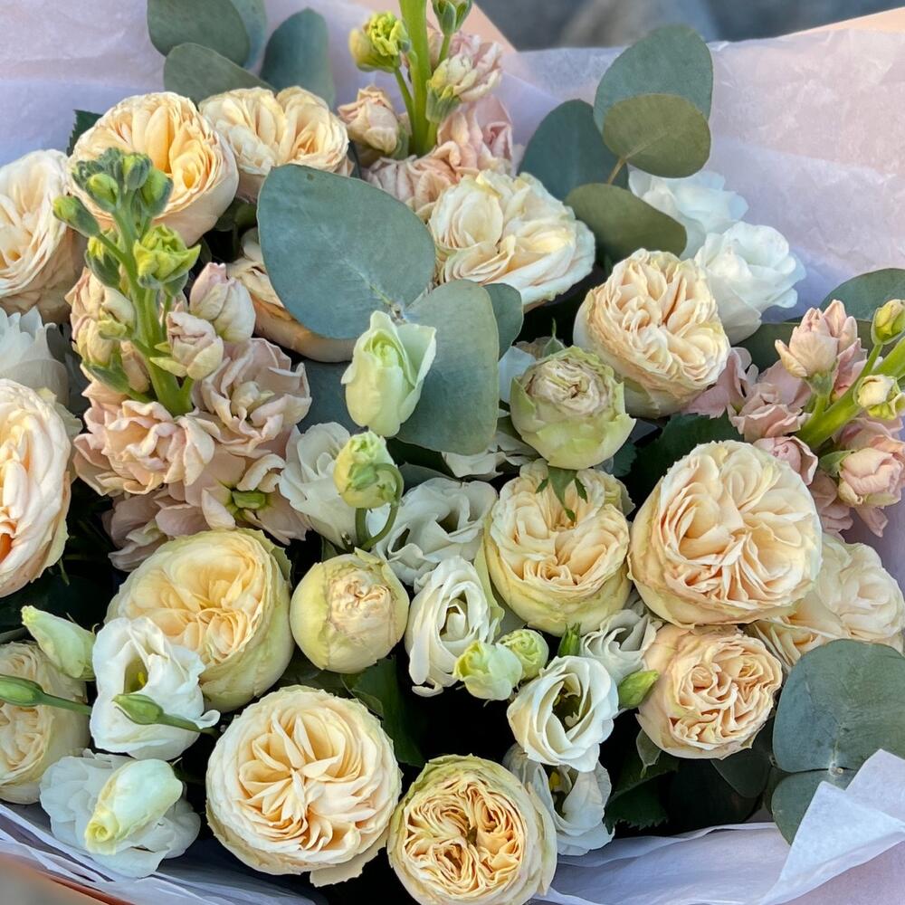 эустома белая – 3 шт.роза кустовая пионовидная трендсеттер – 3 шт.Маттиола – 3 шт.Эвкалипт – 2 шт.Тишью – 2 шт.Пленка дизайнерская – 2 шт.