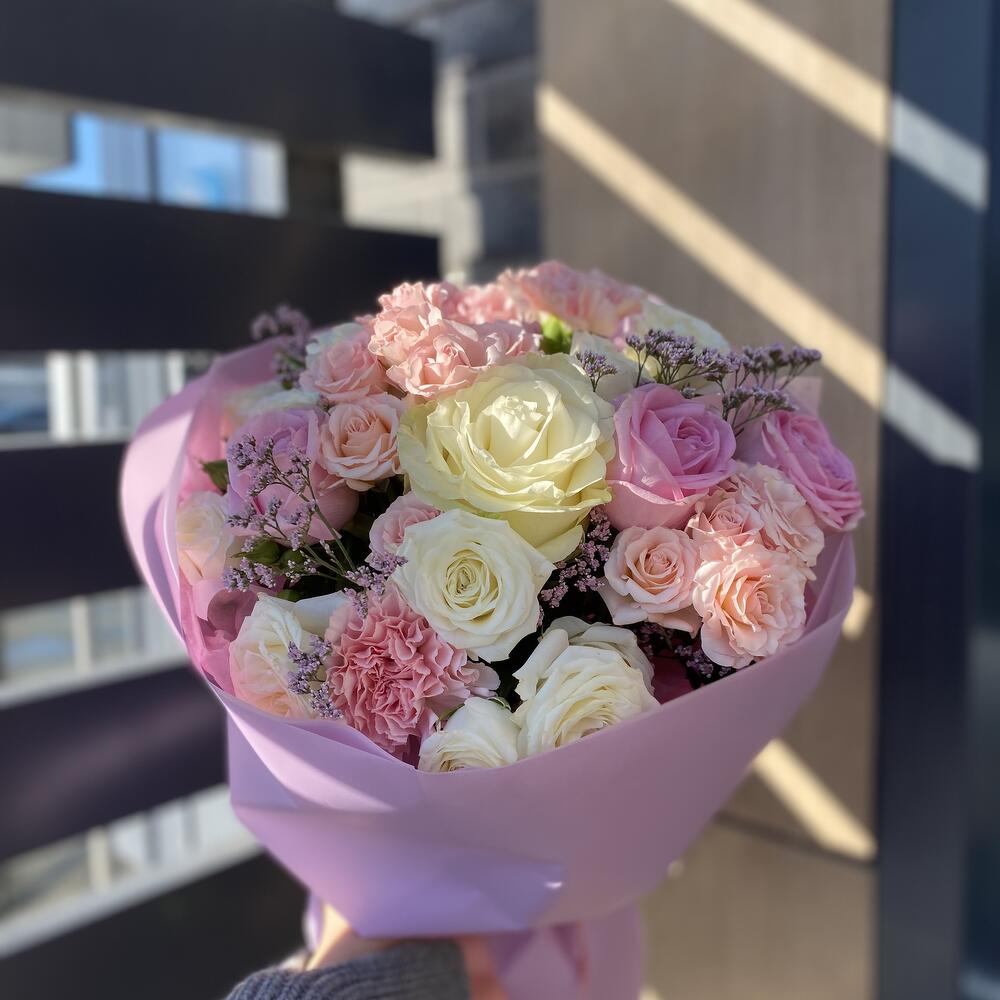 Гвоздики, Лизиантусы, Розы, Тюльпаны