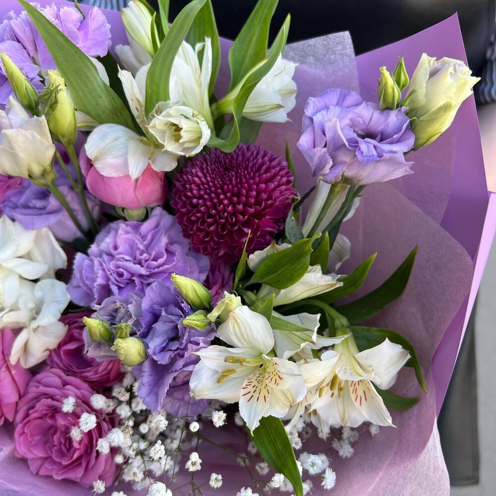 Альстромерия – 2 шт.Гипсофила – 1 шт.Фрезия – 1 шт.Лента атласная – 1 шт.Диантус – 2 шт.Роза кустовая пионовидная – 2 шт.Упаковка дизайнерская – 3 шт.подкормка для срезанных цветов – 1 шт.памятка по уходу – 1 шт.хризантема густав – 1 шт.