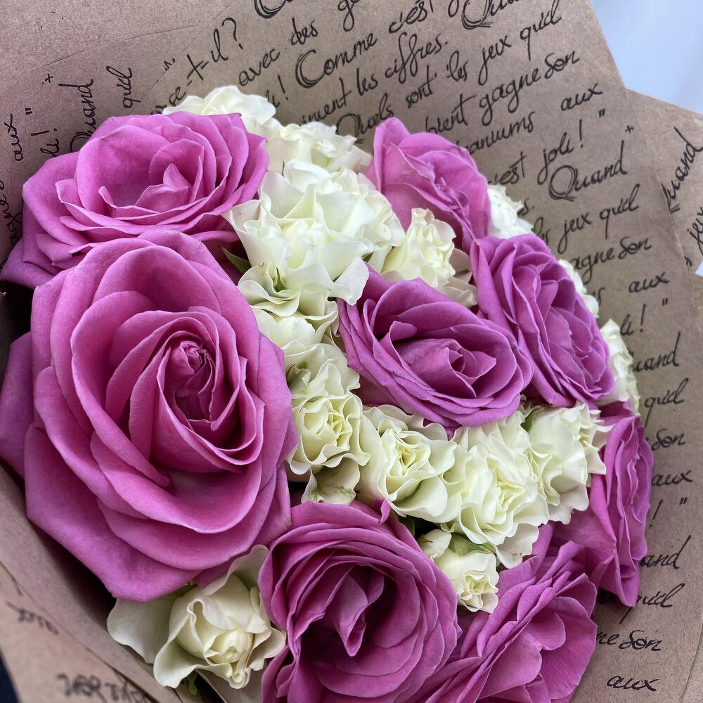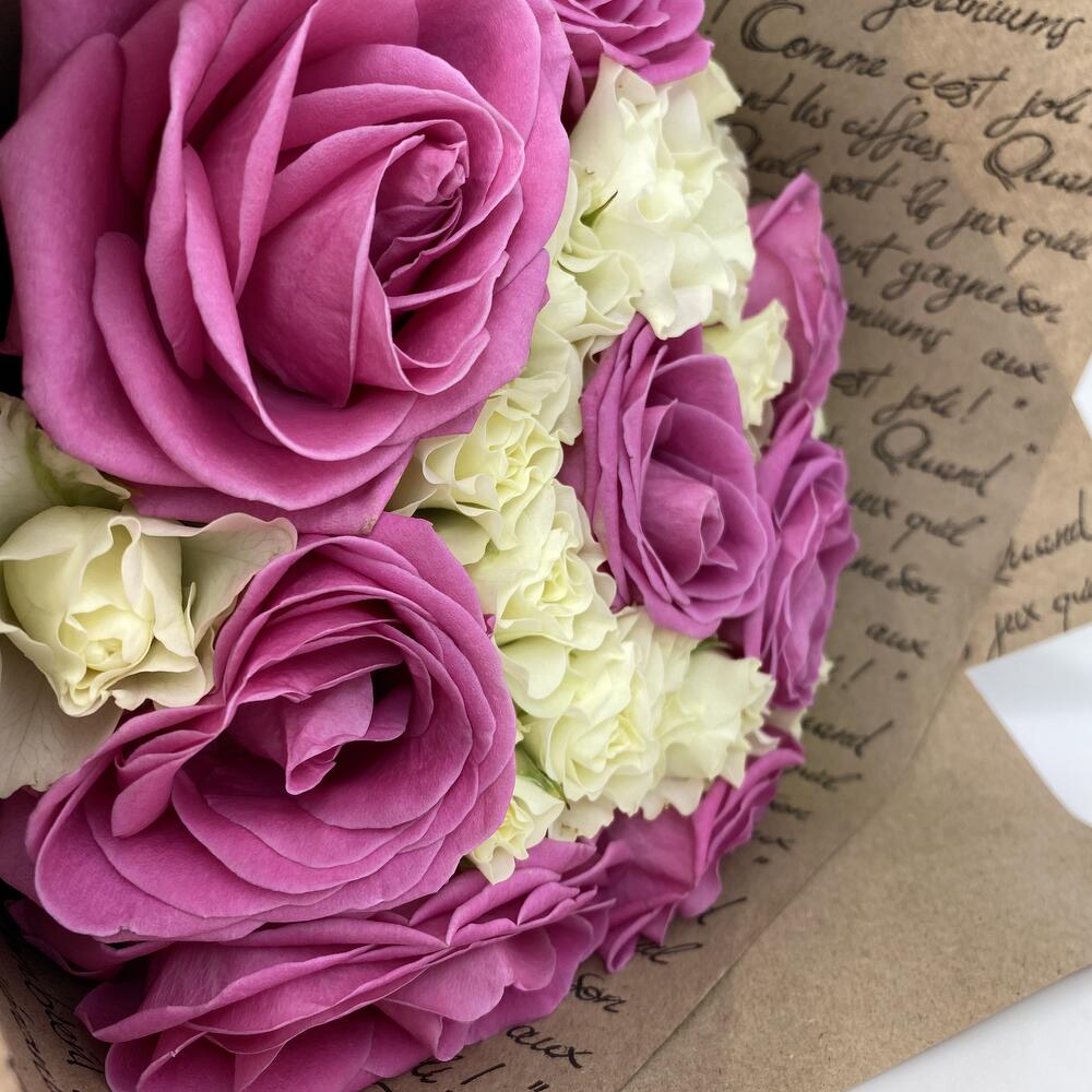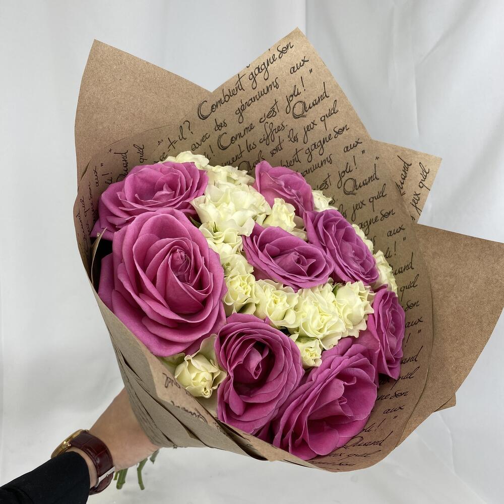 Роза кустовая – 7 шт.Роза одноголовая – 8 шт.Атласная лента – 1 шт.Крафт-упаковка – 3 шт.