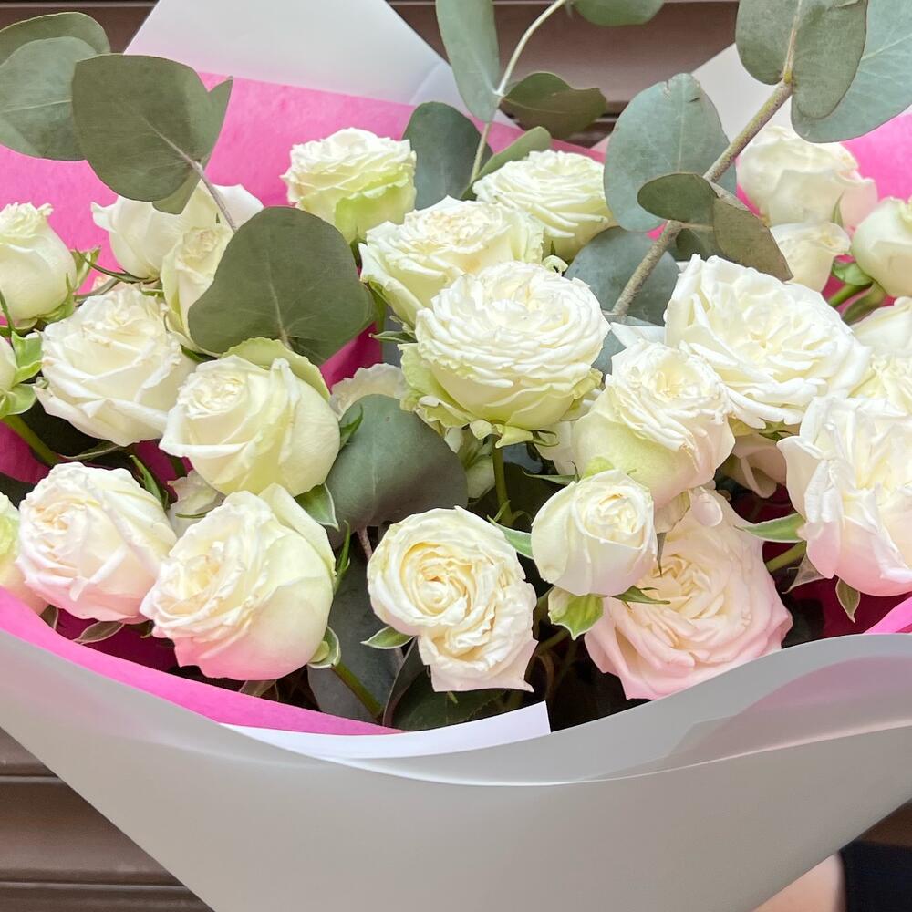 Кустовая роза Бомбастик – 5 шт.Эвкалипт – 4 шт.Тишью – 1 шт.Пленка матовая – 2 шт.Лента атласная – 1 шт.