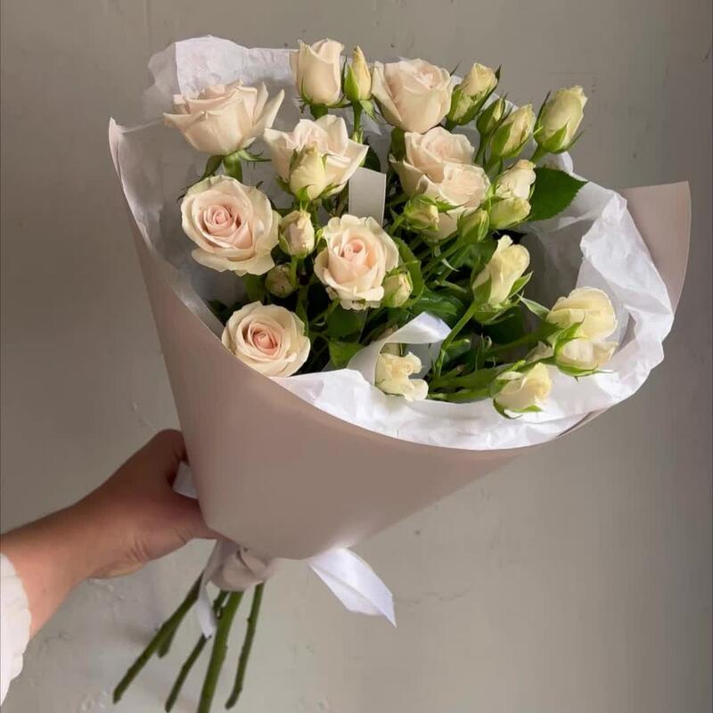 Роза кустовая – 5 шт.Лента атласная – 2 шт.Упаковка дизайнерская – 2 шт.