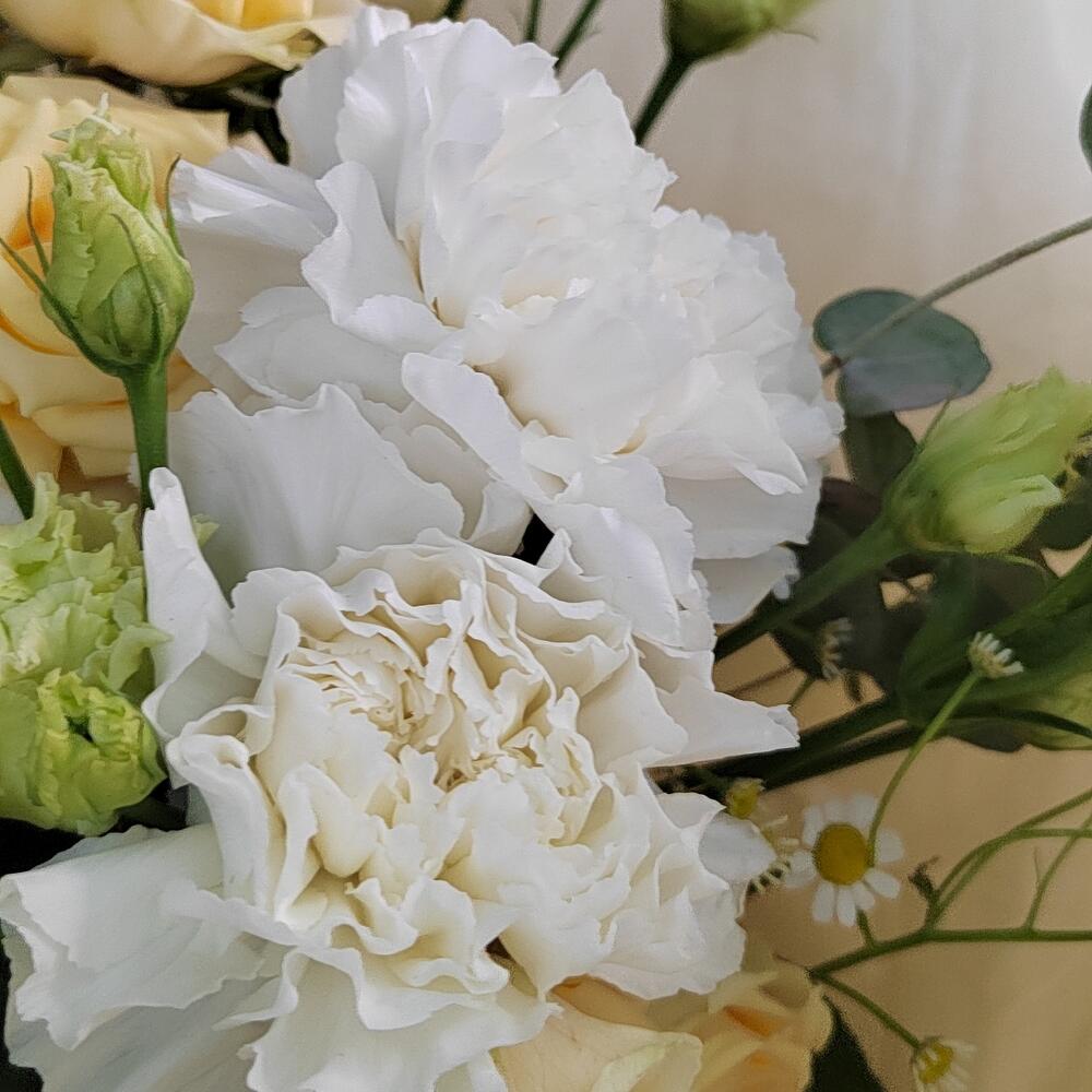 Роза кустовая – 4 шт.Гвоздика – 7 шт.Матрикария – 4 шт.Эустома – 4 шт.Эвкалипт – 3 шт.