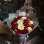 Роза красная – 10 шт.Роза белая – 5 шт.Гипсофила – 2 шт.Упаковка – 2 шт.