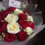 Букет из красных и белых роз с гипсофилой в стильной упаковке “Фолсен”