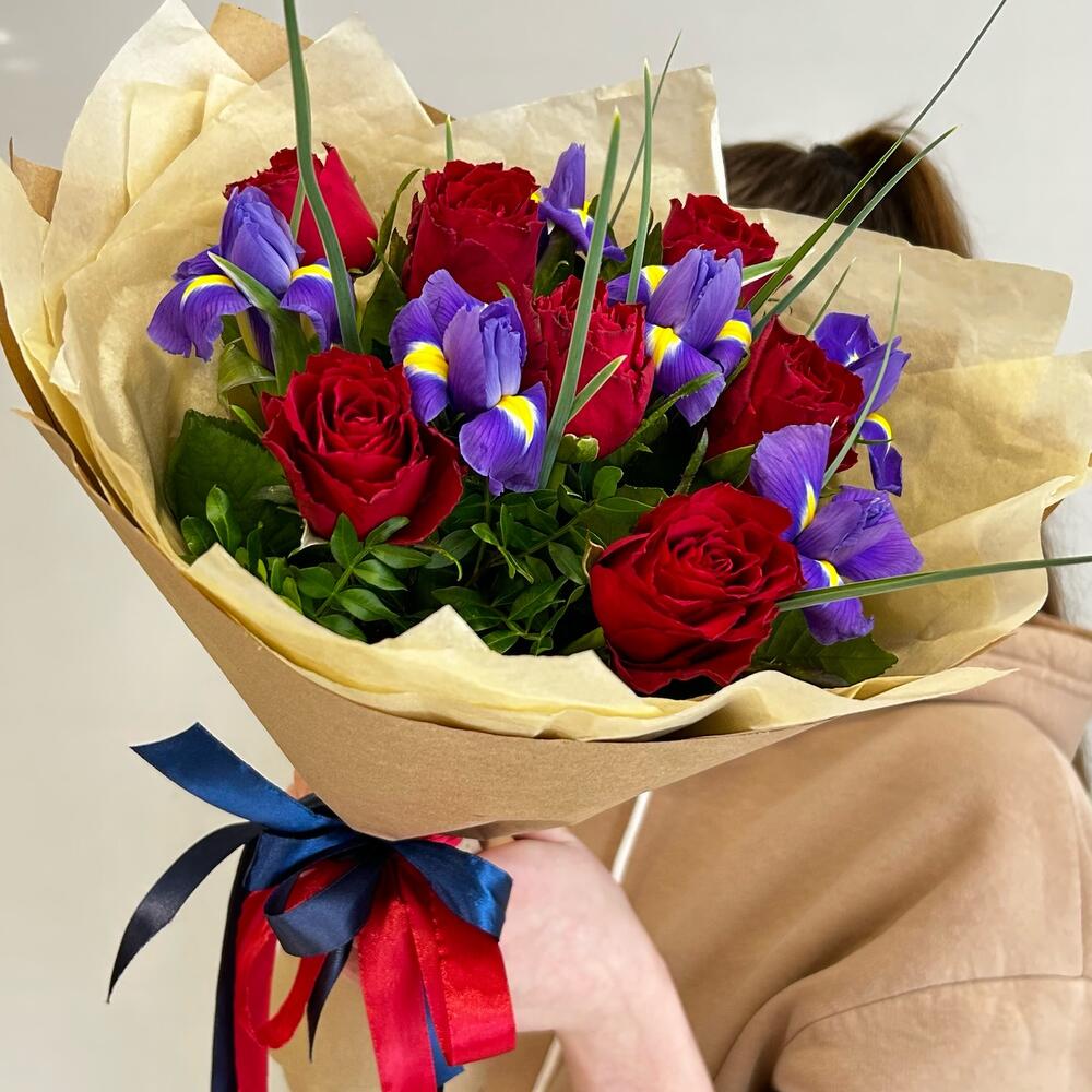 Букет из красных роз и фиолетовых ирисов