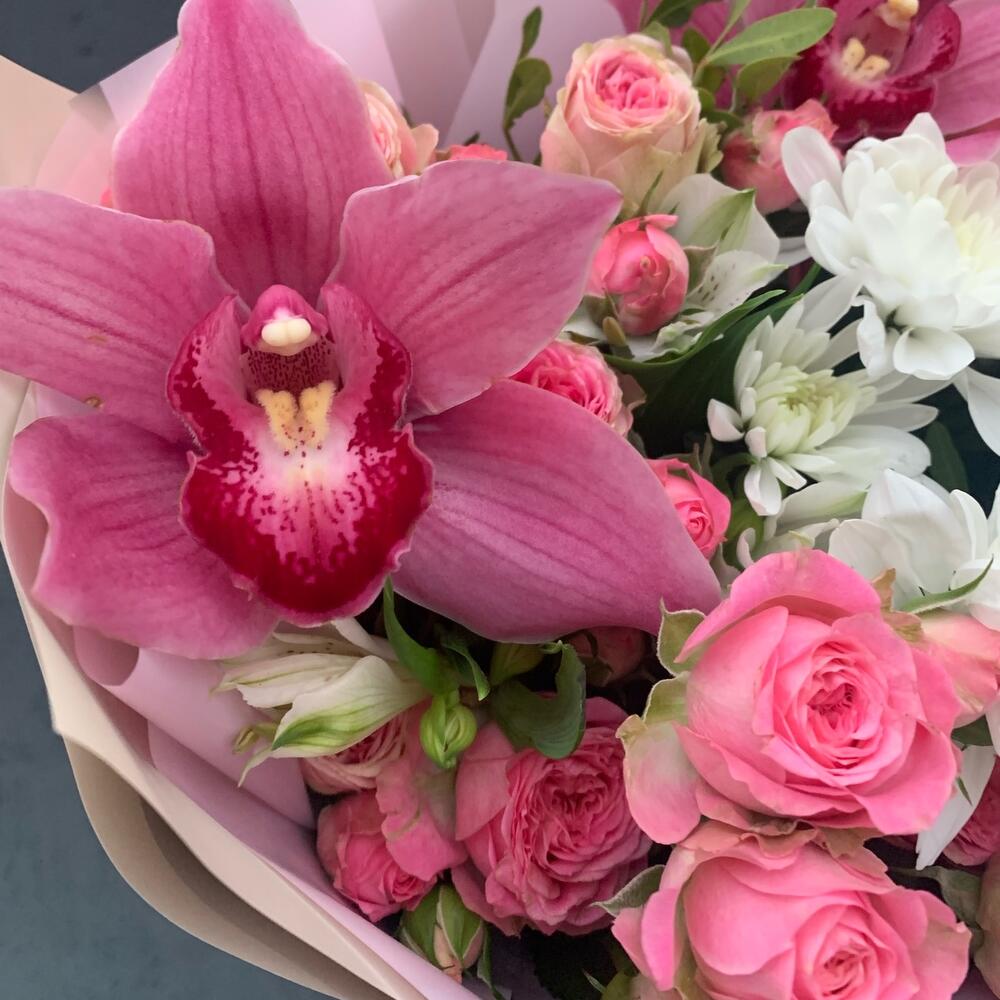 Букет из орхидей,кустовых роз,альстромерий,хризантем и зелени Каролина