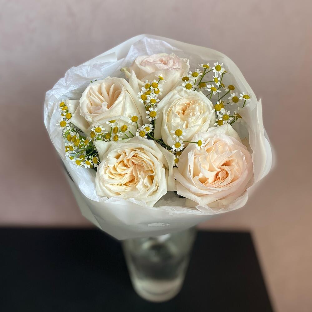 пионовидная роза white o’hara – 5 шт.Танацетум – 3 шт.декоративная упаковка – 1 шт.Атласная лента – 1 шт.