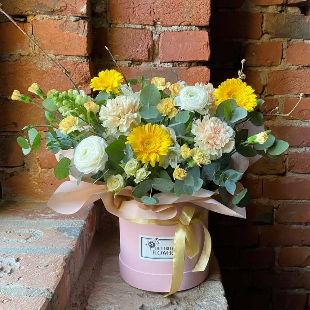 Букет из ранункулюсов, гвоздик, гербер, кустовых роз и эвкалипта в стильной шляпной коробке “Солнце Афин”
