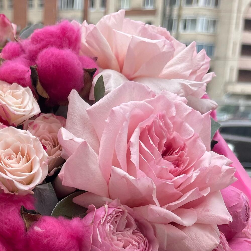 white o’hara – 3 шт.Кустовая роза – 7 шт.Пионовидная роза – 2 шт.Хлопок натуральный – 3 шт.Салал – 5 шт.Тишью – 4 шт.Пленка матовая – 1 шт.Лента атласная – 2 шт.