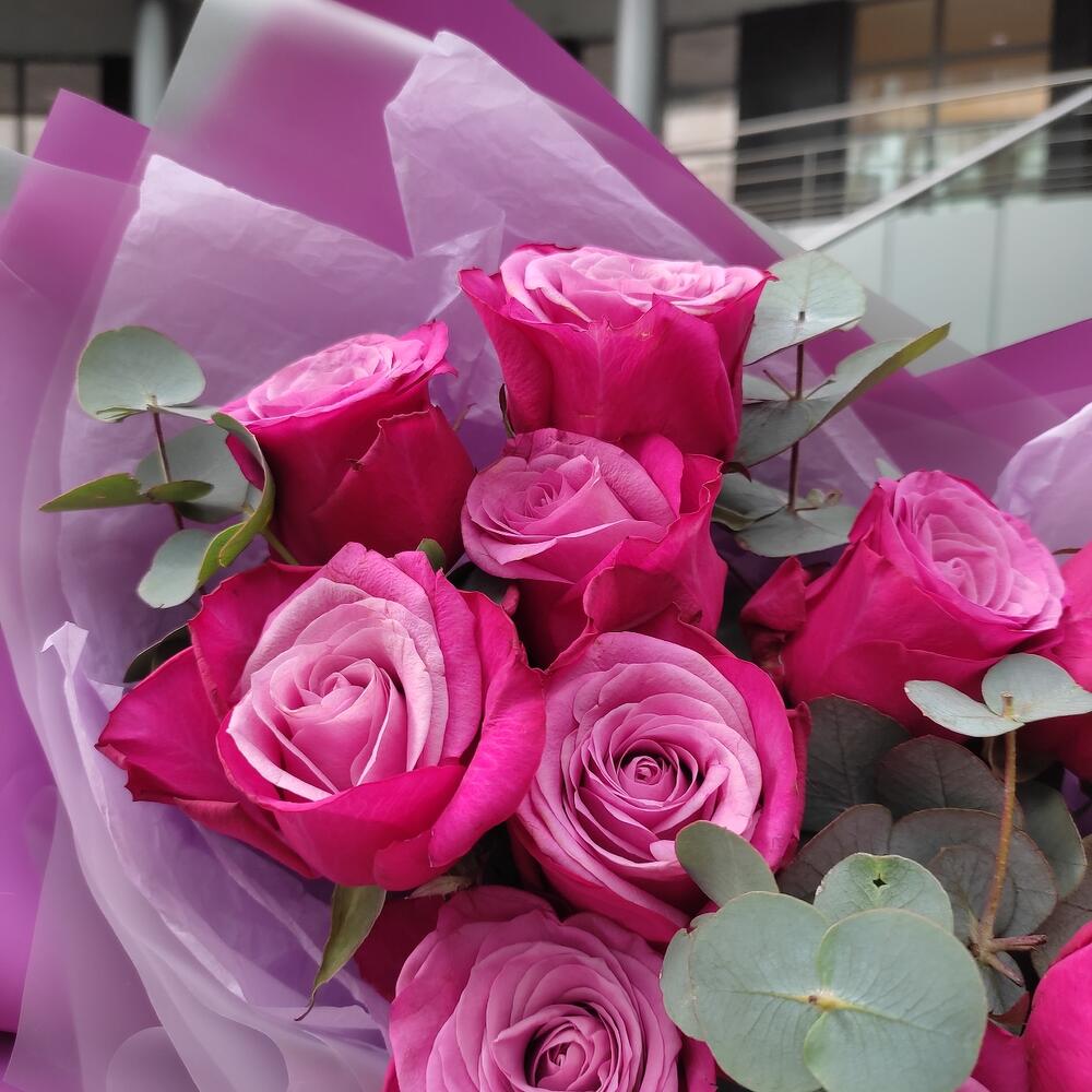 Роза – 11 шт.Эвкалипт – 1 шт.Лента – 2 шт.Упаковка дизайнерская – 2 шт.
